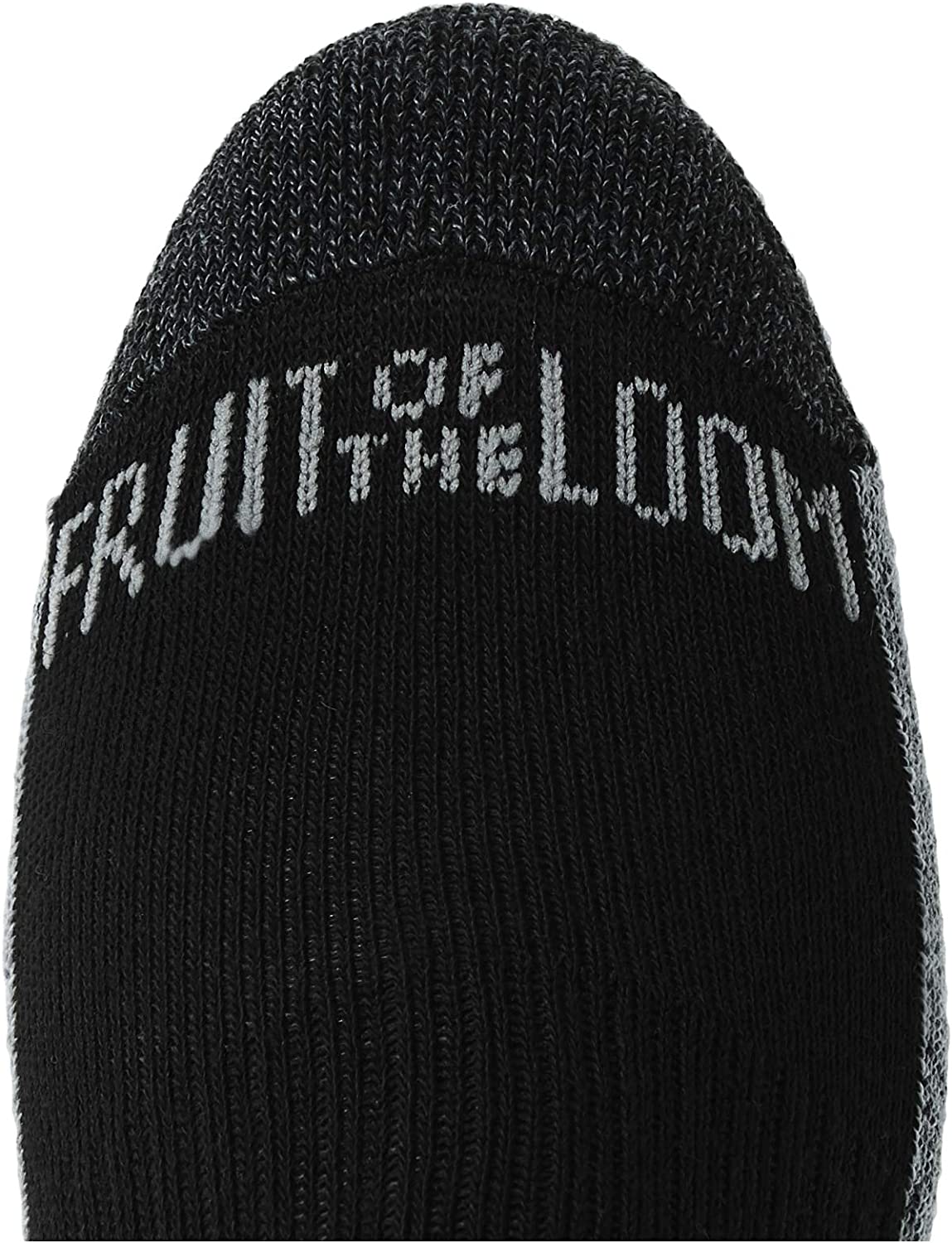 Fruit of the Loom socks are comfortable, affordable, and built to last. These men's crew socks feature arch support, a durable gray cushioned sole, and spandex throughout. The black silhouette features stays black fabrication. 6 pairs per package. Fits men's shoe size 6-12.
