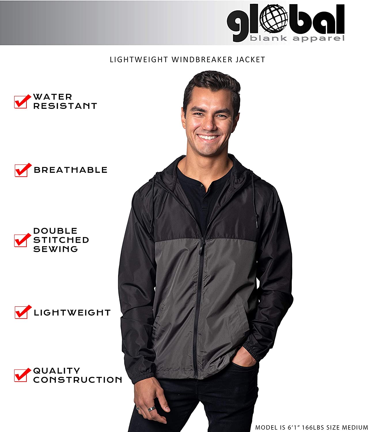 Global Blank Lightweight Winter Water-Resistant Windbreaker, Zip-Up Hoodie Jacket for Men and Women