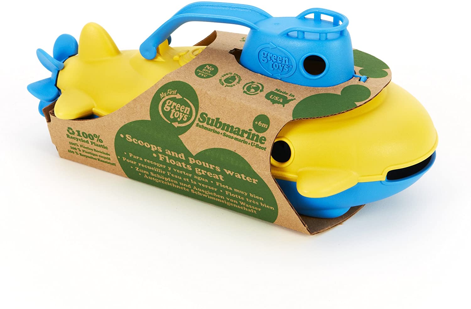 Take the helm of the Green Toys Submarine for a nautical journey to help protect the planet. Submerge it underwater to explore the terrain at the bottom of the tub and let it resurface to scan the horizon in search of the next adventure. Made in the USA from 100% recycled plastic milk jugs that save energy and reduce greenhouse gas emissions, this sturdy watercraft features a spinning rear propeller, a flat bottom for added stability, and the classic handle and wide-mouth opening combination for plenty of scoop and pour fun. The cabin can be opened for easy cleaning, while the whole vessel is also dishwasher safe. No BPA, phthalates, PVC or external coatings and also meets FDA food contact standards. Packaged with recycled and recyclable materials and printed with soy inks. Recommended for ages 6 months and above. Dimensions: 10.5"L x 5.5"W x 4"H.