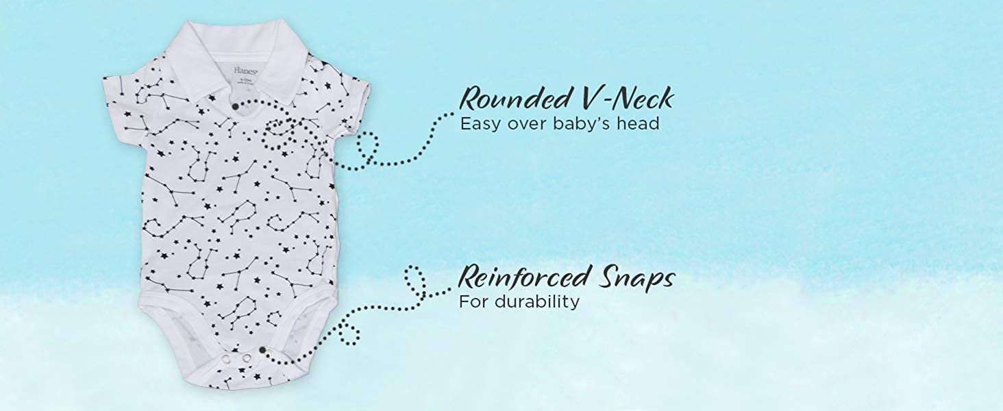 Hanes Ultimate Flexy 3 Pack Short Sleeve Polo Bodysuits were designed with baby in mind. They are super soft, flexible, and are available in 4 simple sizes to fit baby longer.