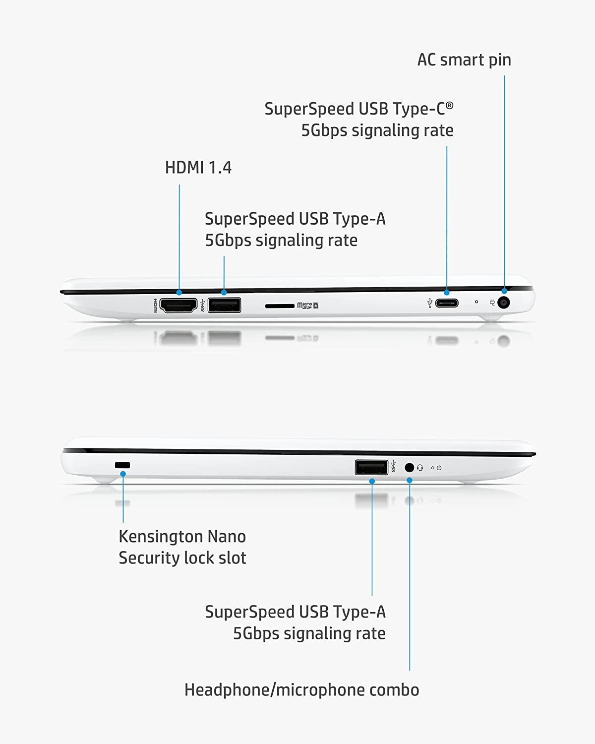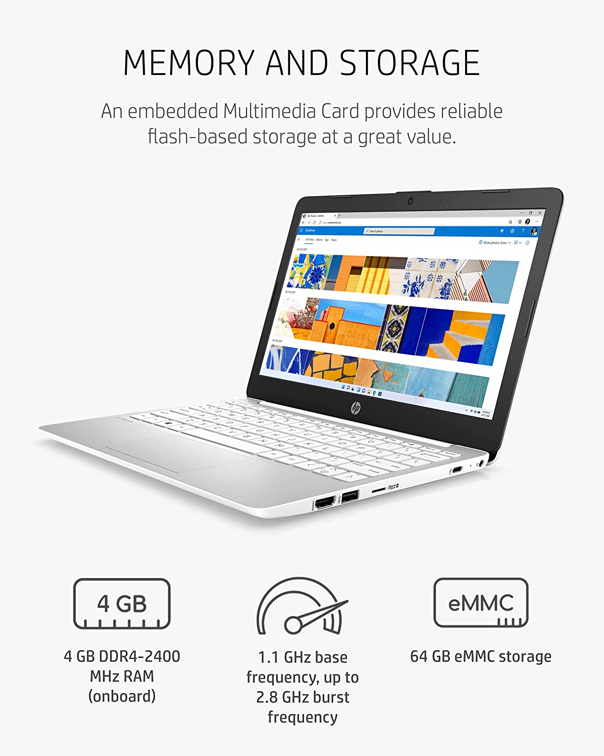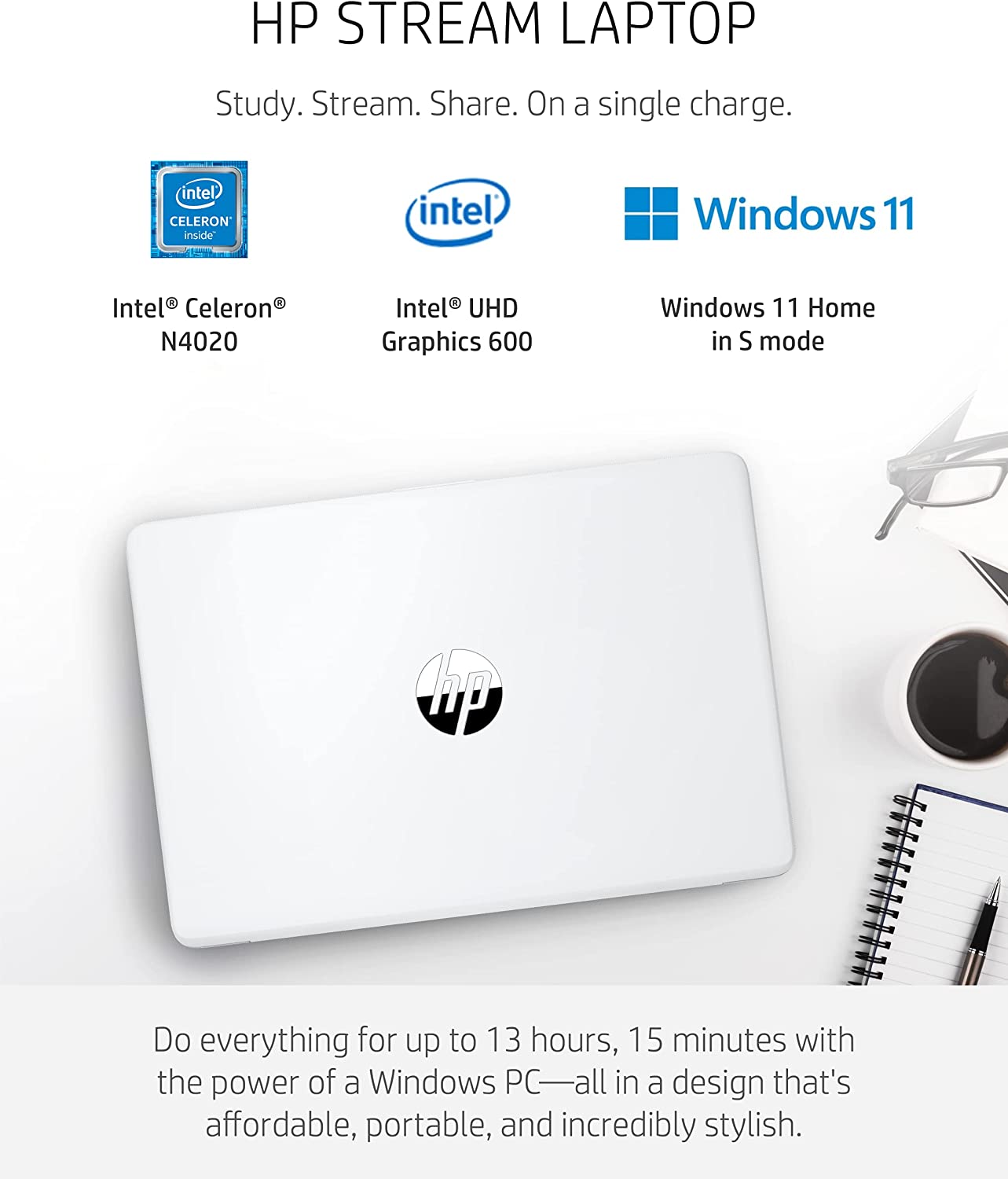Live your best life on the go and in style with the slim and expressive HP Stream 11 Laptop. With its smooth finish, vertical brushed pattern, and pop of Diamond White color, this windows laptop perfectly fits your personality. The design isn't only for looks; the ultra-thin laptop is super portable and its high-definition display contains an anti-glare panel—perfect for travel and computing out in the sun (1). This affordable HP laptop features powerful and reliable hardware, such as the dual-core Intel® Celeron® N4020 processor (2) and Intel® UHD Graphics 600 (3). Plus, with an embedded Multimedia Card, you’ll enjoy 64 GB of storage for greater content security, fewer moving parts, and at a great value (4). Additionally, experience a boost to your 11.6-inch laptop’s overall performance and bandwidth thanks to 4 GB of RAM. And with up to 13 hours and 15 minutes of battery life, you’ll enjoy all that processing power and storage options from the start of your workday to the end of your evening streaming (5). Experience quicker boot-ups and strong protection against phishing and malware with the Windows 11 Home in S Mode (6). Plus, your device's 1-year limited hardware warranty provides even more peace of mind. Whether you’re at home, the office, or in class, the dependable Realtek RTL8822CE 802.11a/b/g/n/ac (2x2) Wi-Fi® (7) and Bluetooth® 5.0 (8) combo is just the solution for preventing unwanted connection drops or waiting on endless load screens. Take advantage of a free 1-year subscription to Microsoft 365 and utilize the many new smart assistance tools and other creativity promoting features this HP laptop computer has to offer (9). Stay productive anywhere while shrinking your carbon footprint with a PC laptop that's not only built with sustainability in mind, but is also ENERGY STAR® certified (10) and EPEAT® Silver registered (11). (1) High-definition (HD) content is required to view high-definition images. (2) Multi-core is designed to improve the performance of certain software products. Not all customers or software applications will necessarily benefit from the use of this technology. Performance and clock frequency will vary depending on application workload and your hardware and software configurations. Intel’s numbering, branding, and/or naming is not a measurement of higher performance. Intel, Pentium, Intel Core, Celeron, Iris Xe, Intel logo, and the Intel Inside logo are trademarks of Intel Corporation in the U.S. and other countries. (3) Shared video memory (UMA) uses part of the total system memory for video performance. System memory dedicated to video performance is not available for other use by other programs. (4) For storage drives, GB = 1 billion bytes. The actual formatted capacity is less. Up to 5.1GB of disk is reserved for system recovery software. (5) Battery life tested by HP using continuous FHD video playback, 1080p (1920x1080) resolution, 150 nits brightness, system audio level at 17%, player audio level at 100%, played full-screen from local storage, headphone attached, wireless on but not connected. Actual battery life will vary depending on configuration and maximum capacity will naturally decrease with time and usage. (6) Not all features are available in all editions or versions of Windows. Systems may require upgraded and/or separately purchased hardware, drivers, software, or BIOS update to take full advantage of Windows functionality. Windows 11 is automatically updated, which is always enabled. ISP fees may apply and additional requirements may apply over time for updates. See http://www.windows.com. Windows 11 in S mode works exclusively with apps from the Microsoft Store within Windows. Certain default settings, features, and apps cannot be changed. Some accessories and apps compatible with Windows 11 may not work (including some antivirus, PDF Writers, driver utilities, and accessibility apps) and performance may vary, even if you switch out of S mode. If you switch to Windows 11, you can’t switch back to S mode. Learn more at Windows.com/SmodeFAQ. (7) Wireless access point and internet service required and sold separately. The availability of public wireless access points is limited. Wi-Fi 5 (802.11ac) is backward compatible with prior Wi-Fi 5 specs. (8) Bluetooth® is a trademark owned by its proprietor and used by HP Inc. under license. (9) Microsoft 365 Personal 1-year subscription included. Activation is required within 180 days of the Windows activation date. Microsoft 365 Family and Microsoft 365 Personal have non-commercial rights and are meant for personal use only. See microsoft.com for full details. (10) ENERGY STAR and the ENERGY STAR mark are registered trademarks owned by the U.S. Environmental Protection Agency. (11) Based on U.S. EPEAT® registration according to IEEE 1680.1-2018 EPEAT®. EPEAT® status varies by country. Visit www.epeat.net for more information.