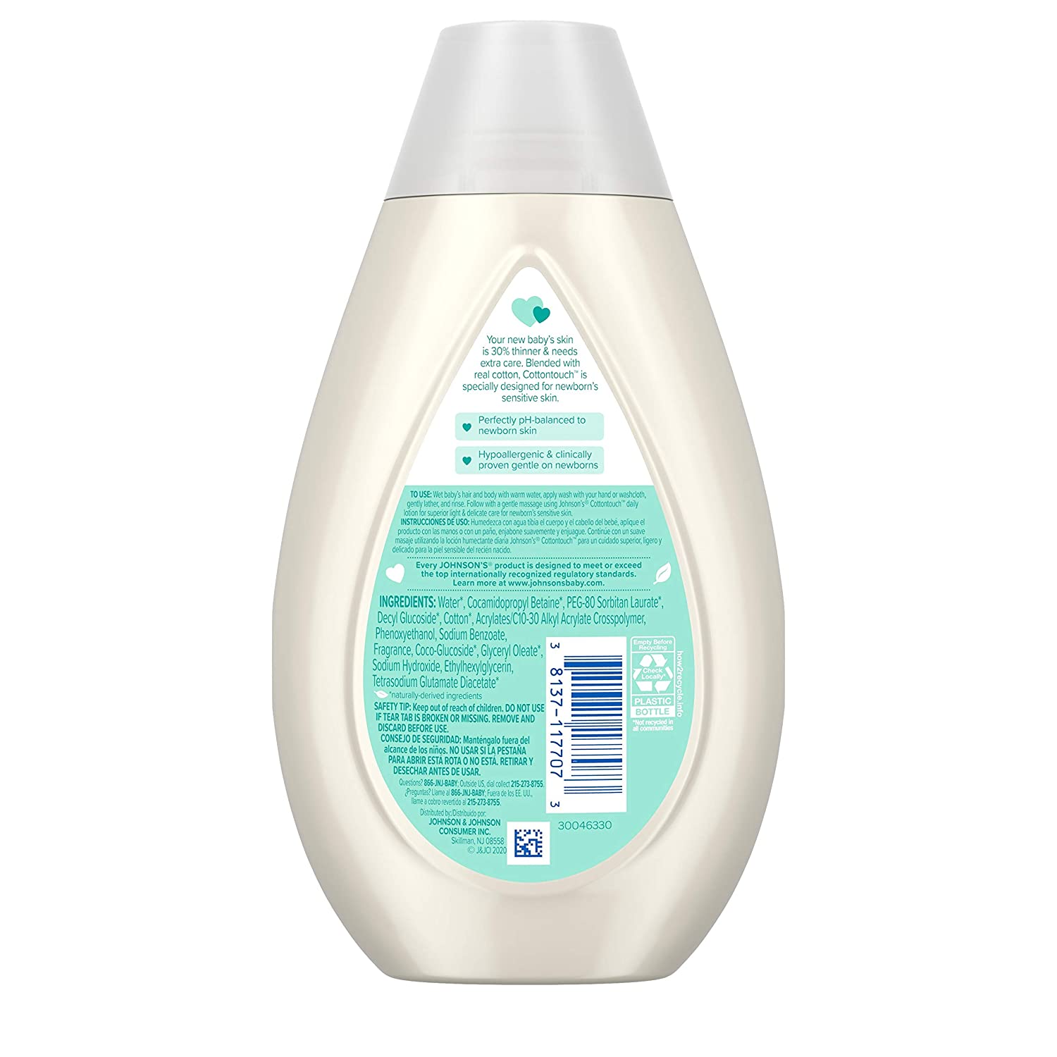 Gently cleanse your baby's skin and hair with Johnson's CottonTouch Newborn Baby Wash and Shampoo. Specially formulated to be gentle on your newborn's sensitive skin, this nourishing baby wash and baby shampoo leaves skin and hair clean and touchably soft. The Johnson's No More Tears won't irritate your baby's delicate eyes during bath time. The light, velvety texture of the wash rinses easily and leaves your baby's hair and skin feeling clean and moisturized. From Johnson's, the number-one choice of hospitals, this tear-free baby wash and shampoo is pH balanced, hypoallergenic, free of parabens, phthalates, sulfates, and dyes. The baby bath wash is blended with real cotton and is soft on a newborn's skin as it gently washes away dirt and germs. Our safety assurance process is designed to meet or exceed governmental regulatory cosmetic standards around the world, so you can feel good about using CottonTouch Newborn Baby Body Wash and Shampoo on your little one.
