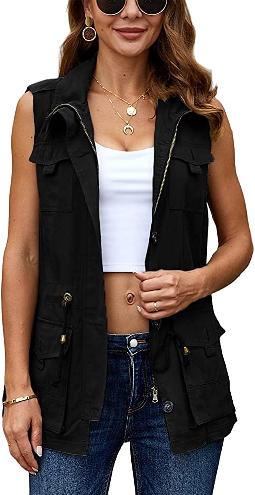 Koodred Women's Casual Military Utility Vest Lightweight Sleeveless Drawstring Jackets with Pockets
