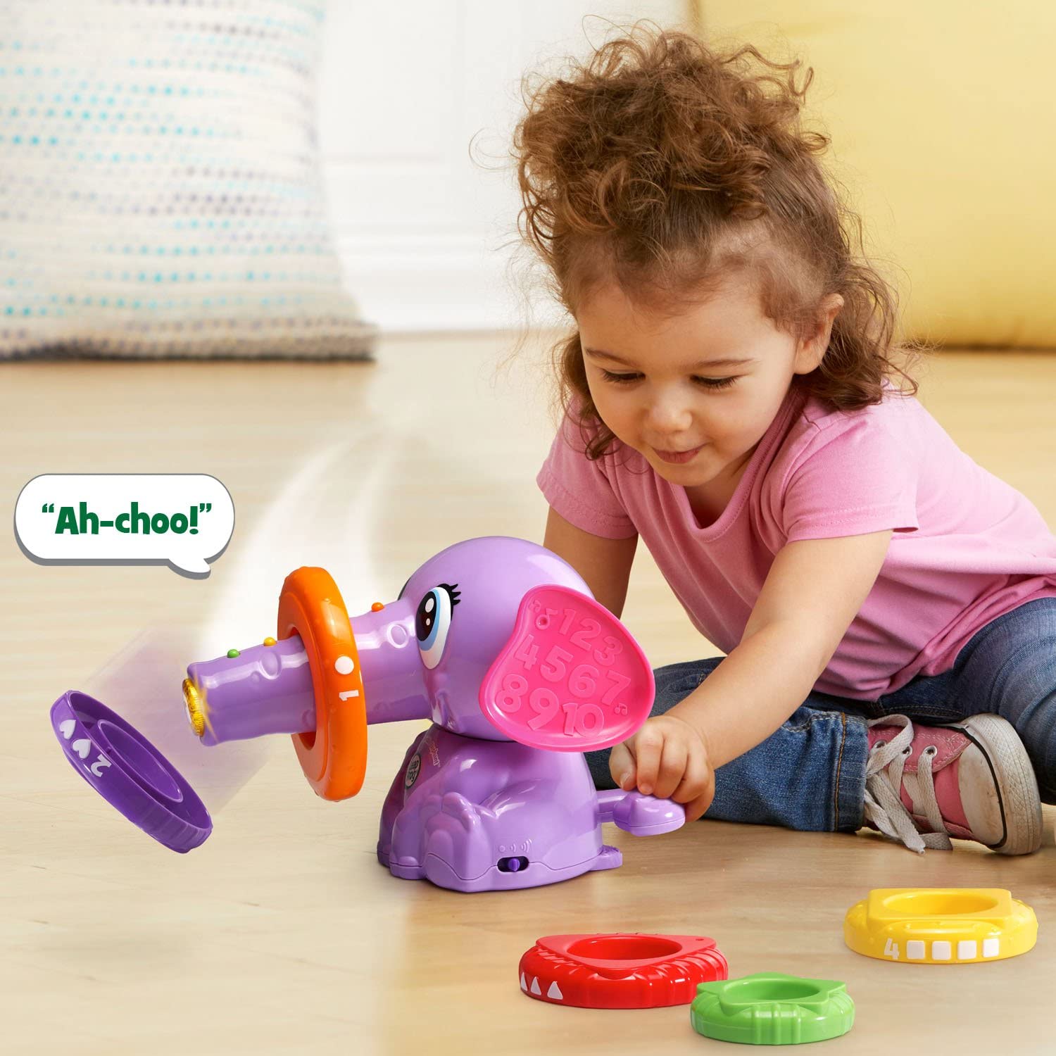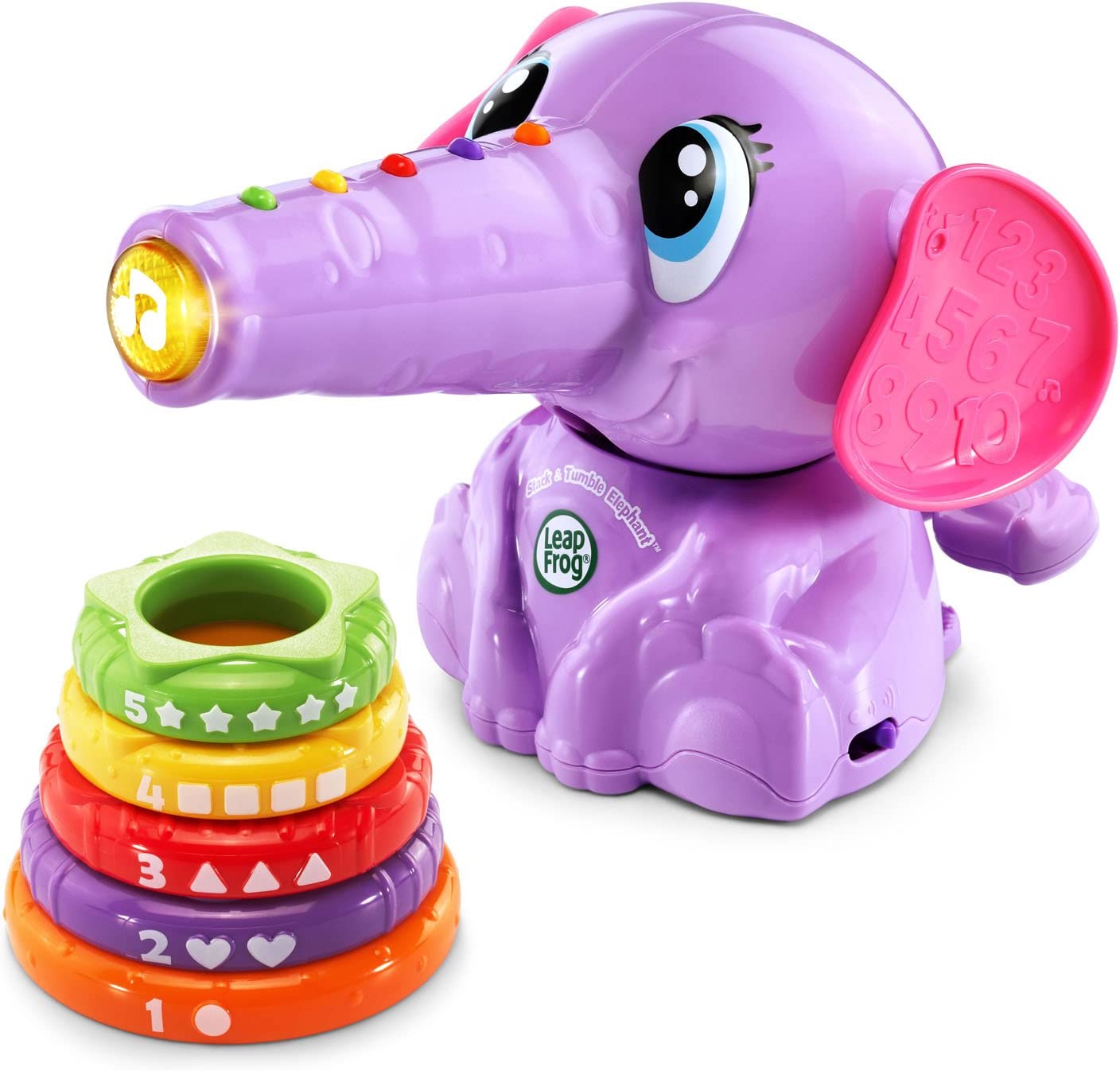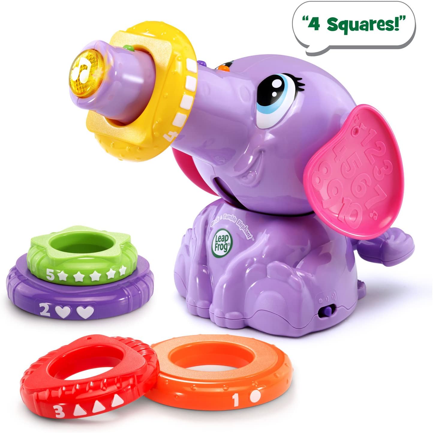 Stacking is tons of fun with the online exclusive purple stack and tumble elephant. Stack the five brightly colored, textured rings on the elephant's trunk. As each ring is placed on the trunk, she will introduce colors, numbers and or shapes. Press the music note button on the elephant's trunk to hear playful songs. Push down on her tail and watch her sneeze, sending the rings tumbling off her trunk. Then play again!
