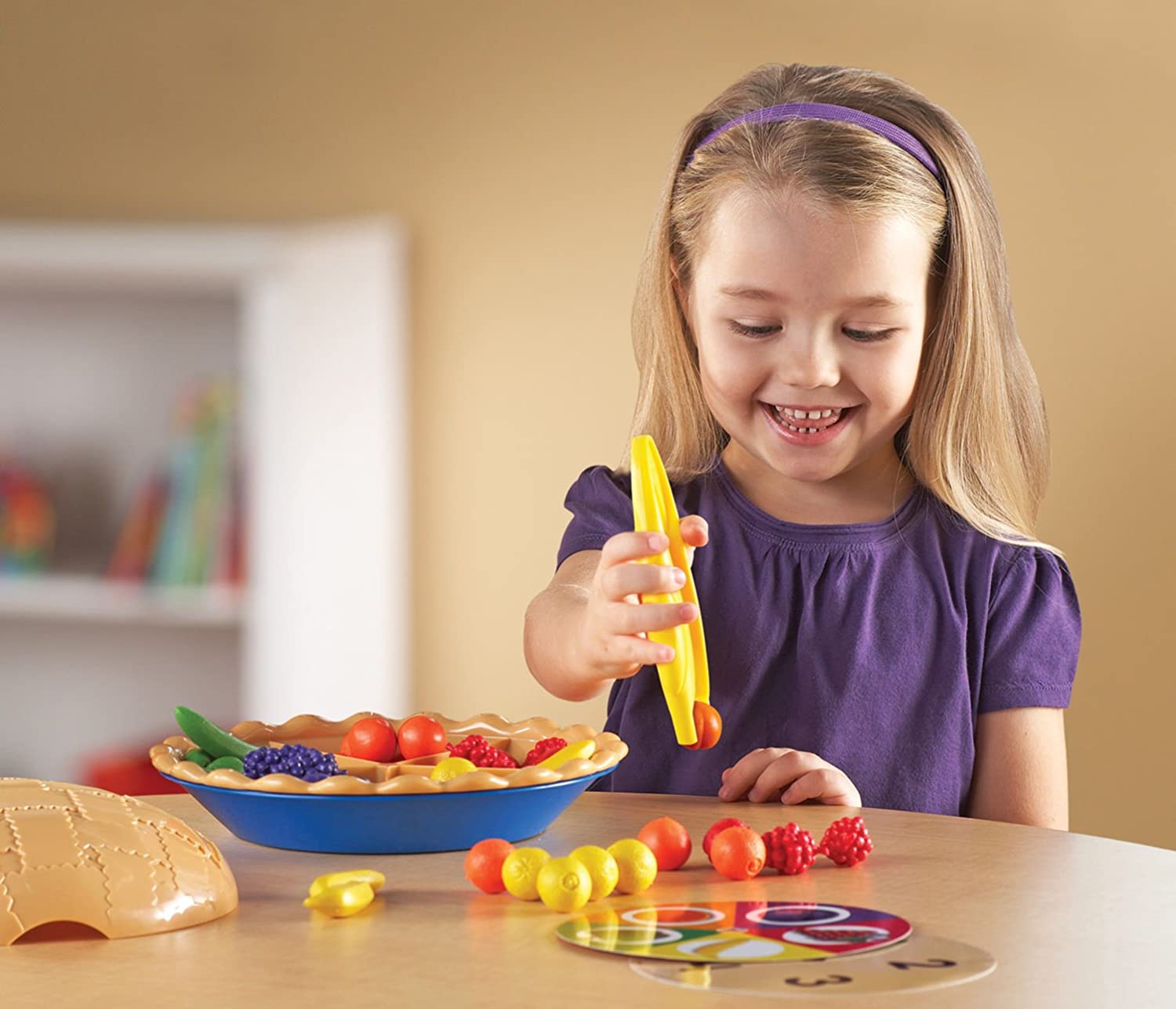 Make learning early number skills, including counting, as easy (and fun) as pie. Sorting cards go on the bottom of the pan to provide visual cues that support success. The top crust becomes a bowl to conveniently hold counters. Jumbo Tweezers reinforce fine motor skills. 68-piece set.