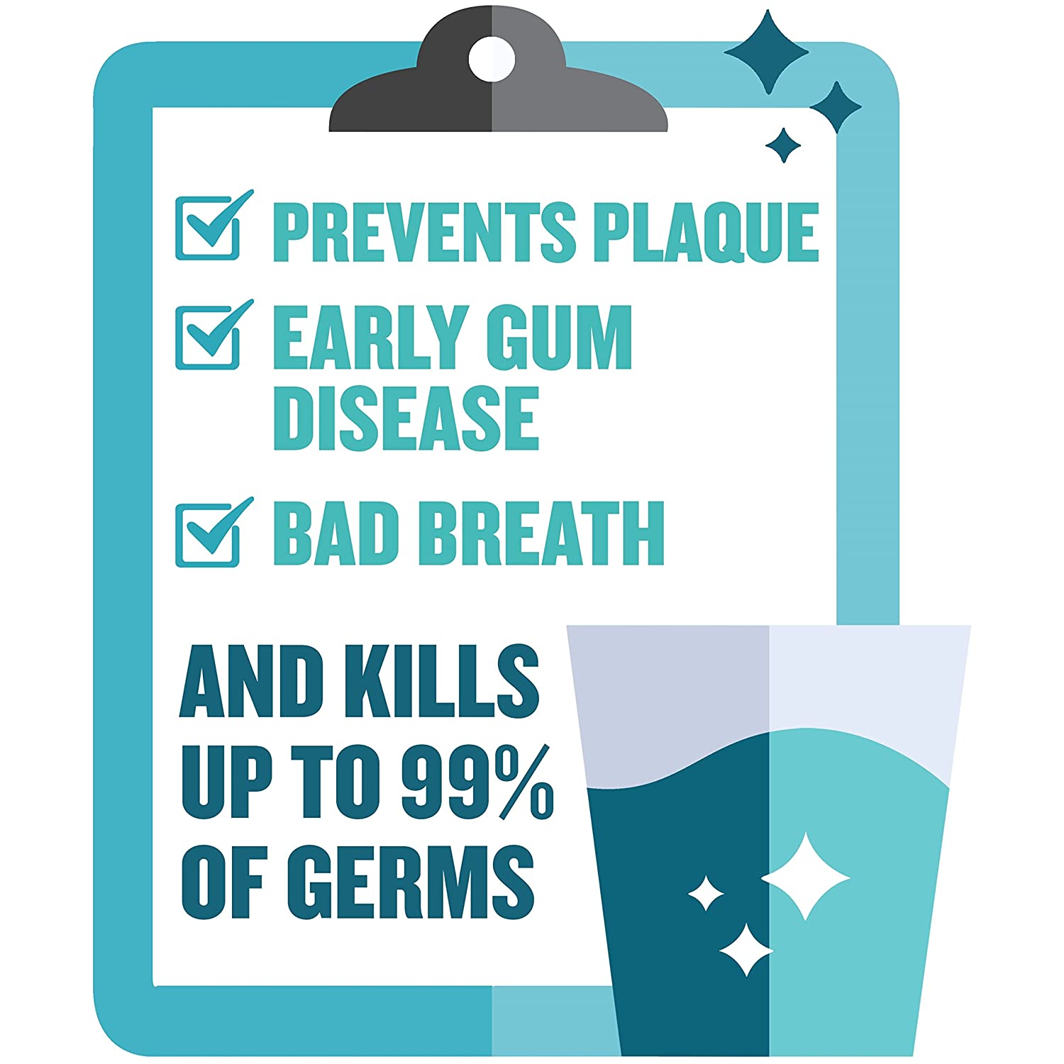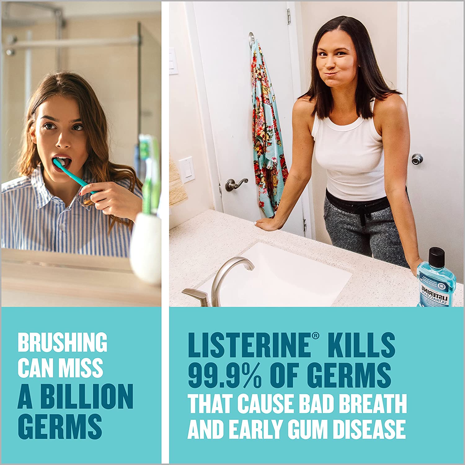 Protect your mouth from germs and get fresh breath with Listerine Cool Mint Antiseptic Mouthwash. It kills 99.9% of germs that cause bad breath, plaque and gingivitis, for a fresher and cleaner mouth than brushing alone. Accepted by the American Dental Association, this germ-killing mouthwash for bad breath is clinically shown to reduce plaque 52% more and reduce gingivitis 21% more than brushing and flossing alone. Adding a 30-second rinse to your morning and evening routines is all it takes to get 24-hour germ protection and achieve maximum results. Listerine Cool Mint Antiseptic Mouthwash leaves your mouth feeling intensely clean.
