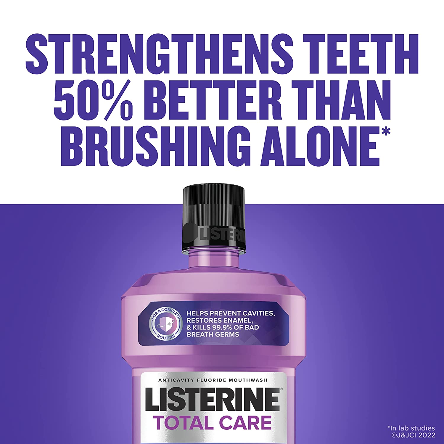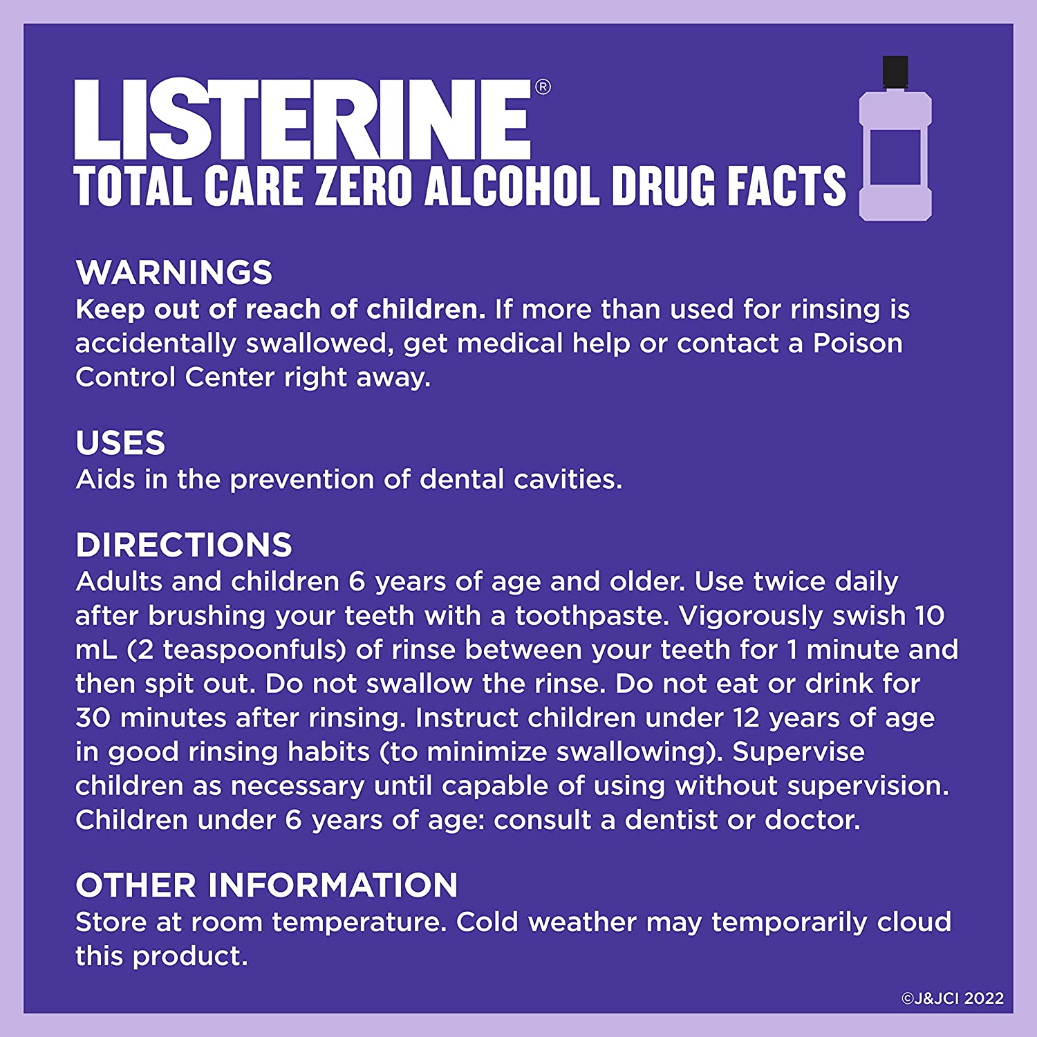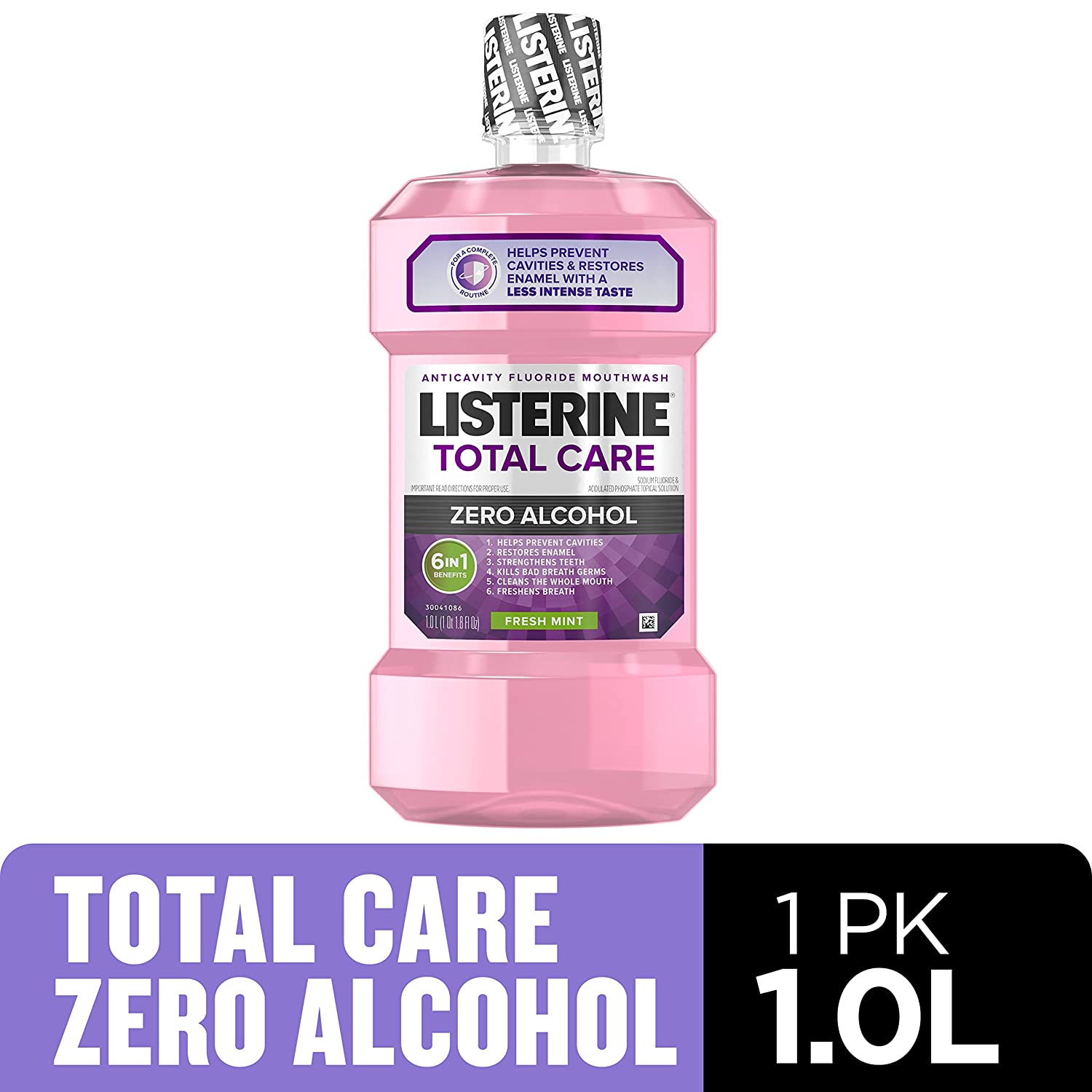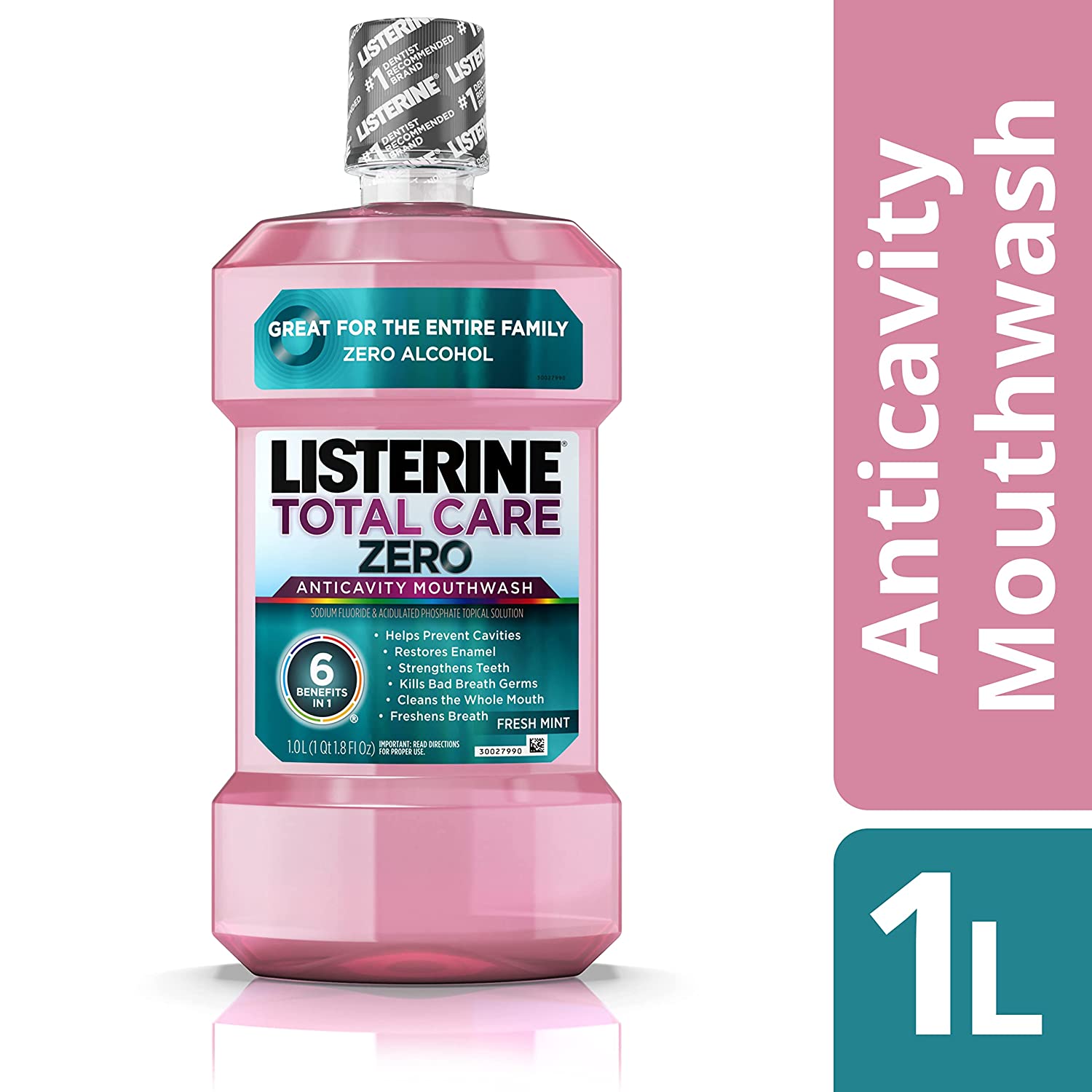 Give your mouth complete oral care with Listerine Total Care Zero Alcohol-Free Fluoride Anticavity mouthwash. Listerine Total Care Zero provides the same six dental hygiene benefits in one as Listerine Total Care Fluoride Anticavity Mouthwash, but in a less intense, alcohol-free mouthwash formula. With up to 2.4x the fluoride uptake than Act mouthwash brand**, this daily fluoride oral rinse formula helps prevent dental cavities by providing 50% greater strengthening of weakened enamel vs. brushing alone*. It freshens breath, kills 99% of germs that cause bad breath, cleans your whole mouth. From the #1 dentist-recommended brand of over the counter mouthwashes, this mouthwash for bad breath in Fresh Mint flavor gives your mouth a clean feeling you can taste, all with a zero alcohol formula. *In laboratory studies **In laboratory tests compared to Act Anticavity Fluoride Mouthwash, Act Total Care Anticavity Fluoride Mouthwash.