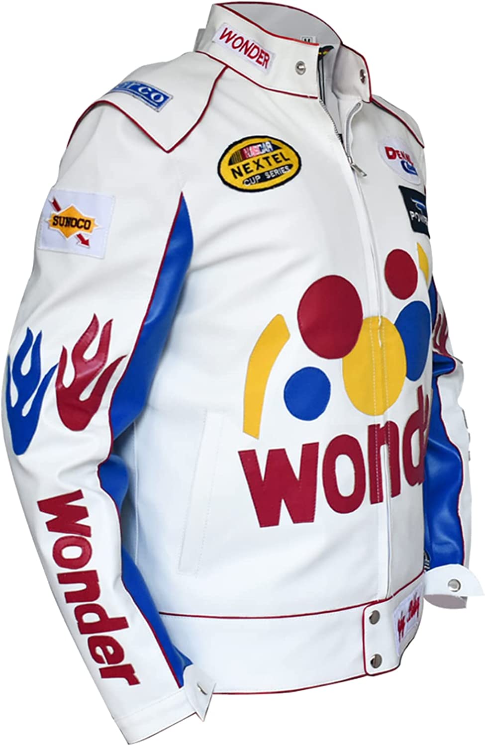Mens Ricky Bobby Racing White Faux Leather Motorcycle Wonder Jacket, XXS-5XL