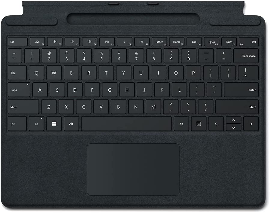 Store, charge, type, and write. Next-level versatility comes in the perfect, premium keyboard, featuring a large glass trackpad and luxurious, Alcantara® material covering. Ready to pair with Surface Pro 8* and Surface Pro X.*
