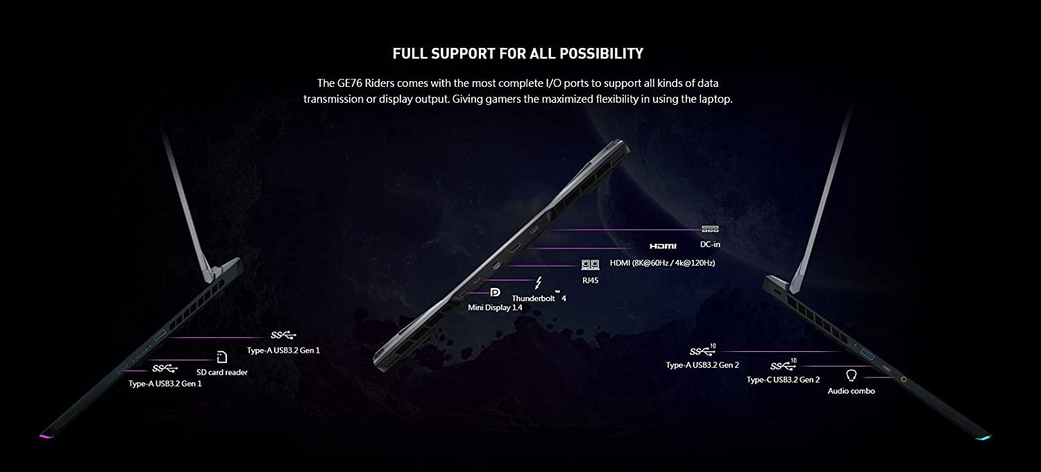 OS - Windows 10 Home CPU - Core i7-11800H 8 Core CPU Speed - 2.4 - 4.6GHz Chipset - HM570 Color - Titanium Blue Screen Size - 17.3" Thin Bezel FHD, IPS-Level 144Hz, 45% NTSC Resolution - 1920x1080 (16:9) GPU - NVIDIA GeForce RTX 3060 Laptop GPU Up to 1802MHz Boost Clock, 130W Maximum Graphics Power with Dynamic Boost. *May vary by scenario. Video Memory - 6G GDDR6 Keyboard Steel Series per-Key RGB with Anti-Ghost key (102 Key) Audio - Nahimic 3 / Hi-Res Audio Speaker - 2 x Dynaudio 2W Speaker + 2 x 1W Woofers Memory - 16GB (8G*2) DDR4 3200MHz HDD Capacity - 1TB NVMe SSD HDD Interface - NVMe LAN - Killer E3100 2.5GbE WLAN - Killer WiFi 6E AX1675 (2x2 ) Bluetooth - BT 5.2 Card Reader - 1x SD7.0 (XC/HC) Webcam - 1080p FHD Webcam USB - 1 x USB3.2 Gen 2; 2 x USB3.2 Gen 1 Type-C Port - 1 x Thunderbolt 4 USB4; 1 x USB 3.2Gen 2 Video Port - HDMI (supports 4K @ 120Hz, 8K @ 60Hz), mDP v1.4*1 Audio Port - 1 Audio Combo (1/8") AC Power Adaptor - 240W Battery Pack - 4 cell (99.9Whr) Dimension - 15.63"x 10.57"x 1.08" Weight - 6.39 lbs