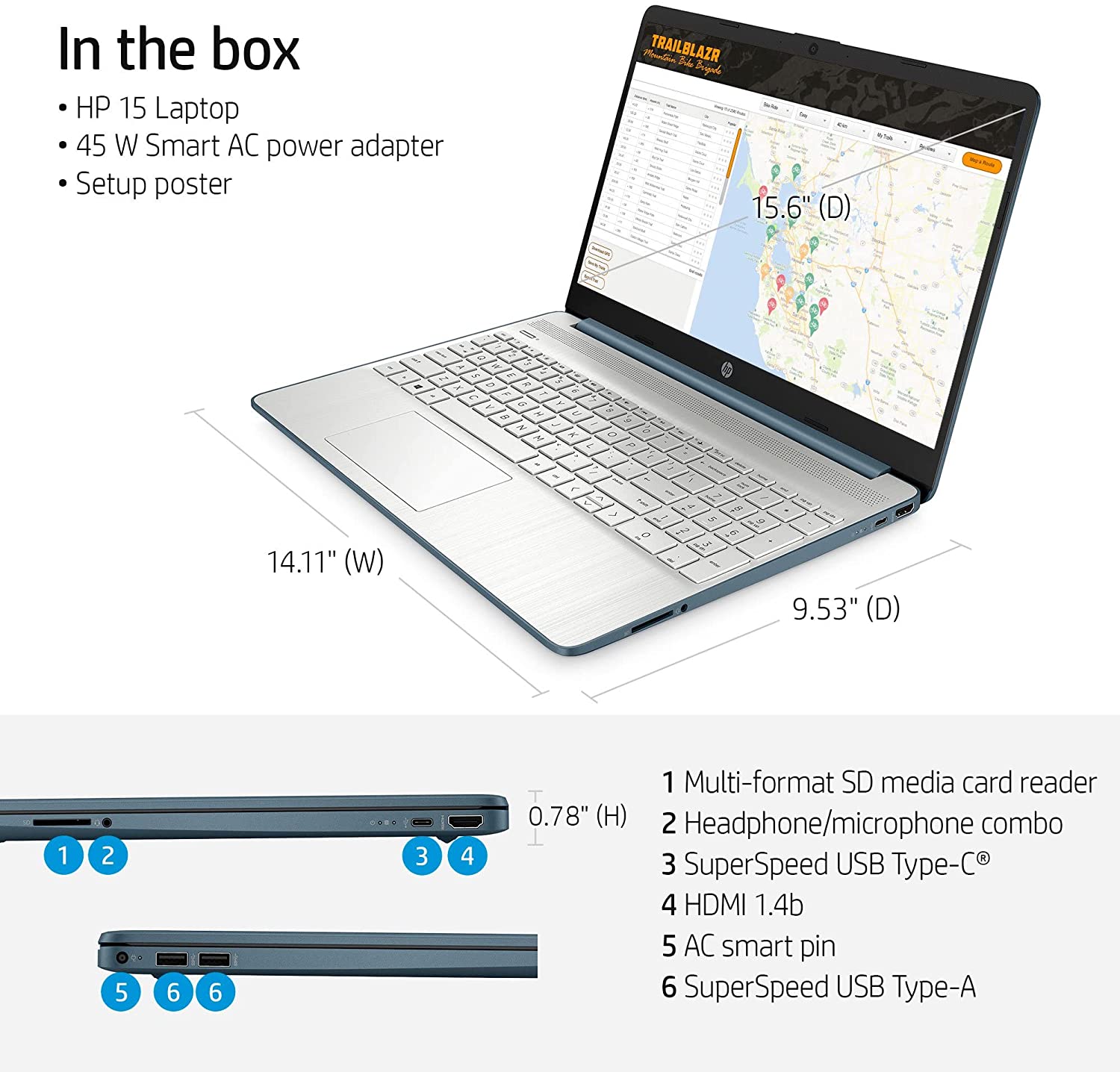 Specifications Processor : AMD Ryzen 5 5500U (up to 4.0 GHz max boost clock, 8 MB L3 cache, 6 cores, 12 threads) Graphics : AMD Radeon Graphics Chipset : AMD Integrated SoC Display : 15.6" diagonal, FHD (1920 x 1080), micro-edge, anti-glare, 250 nits, 45% NTSC Operating system : Windows 11 Home Memory : Upgraded to 16GB DDR4 SDRAM Hard Drive : Upgraded to 512GB PCIe NVMe M.2 SSD Optical Drive : No Connectivity : Realtek RTL8821CE-M 802.11a/b/g/n/ac (1x1) Wi-Fi and Bluetooth 4.2 combo Audio : Dual Speakers Built-in HD Webcam : HP True Vision 720p HD camera with integrated dual array digital microphones Media Drive : 1 multi-format SD media card reader Ports : · 1 SuperSpeed USB Type-C 5Gbps signaling rate; · 2 SuperSpeed USB Type-A 5Gbps signaling rate; · 1 HDMI 1.4b; · 1 AC smart pin; · 1 headphone/microphone combo Battery :45 W Smart AC power adapter,3-cell, 41 Wh Li-ion, Up to 9 hours and 30 minutes Color : SPRUCE BLUE Dimensions L x W x H (inches) : 14.11 x 9.53 x 0.78 in Weight : 3.75 lbs