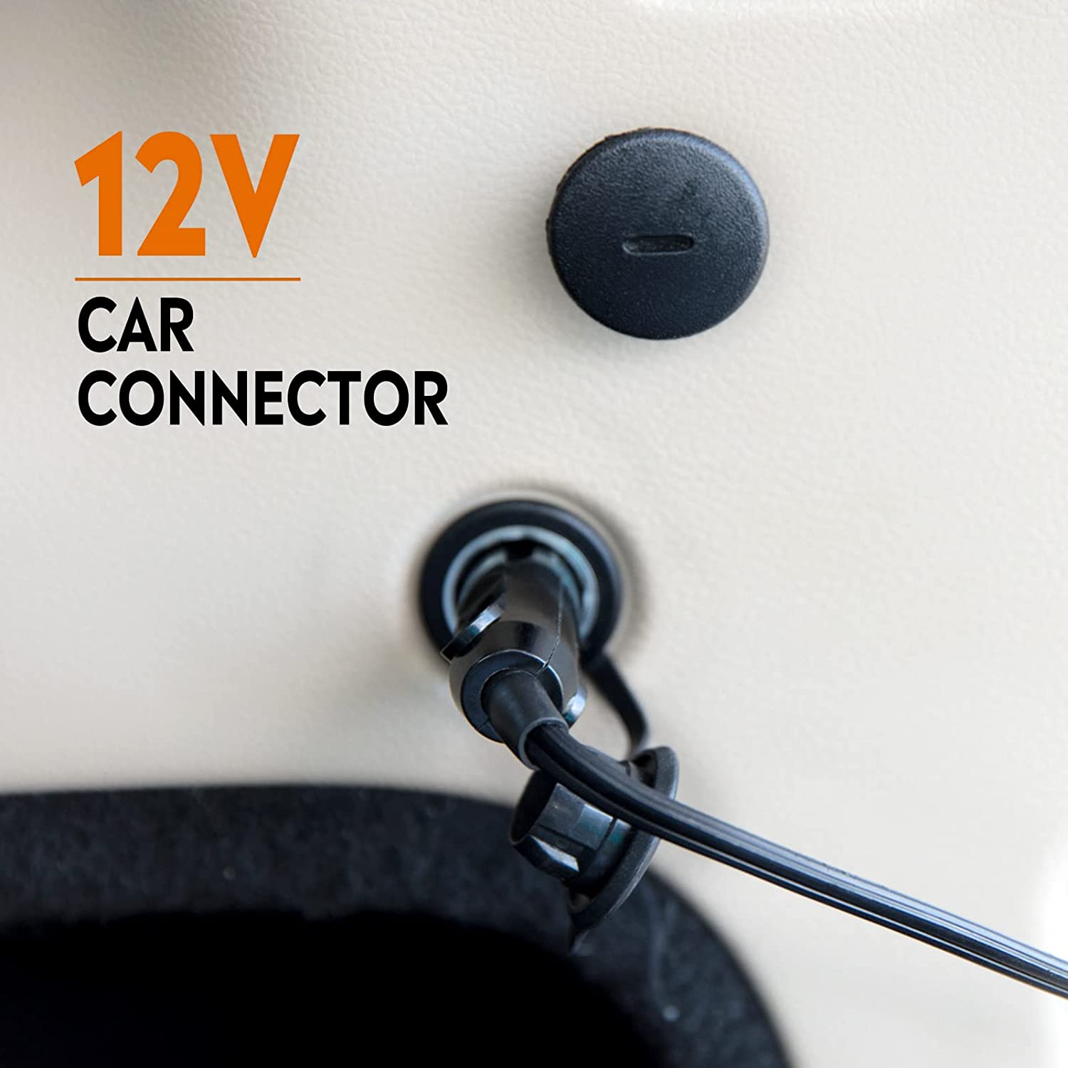 Connects to your car's 12V DC connector. Features a 12A fuse for increased safety. Compact design and BUILT-IN CARRYING HANDLE for easy transportation. Comes with 3 nozzles to fit most high pressure inflatables - one with H3 valve.