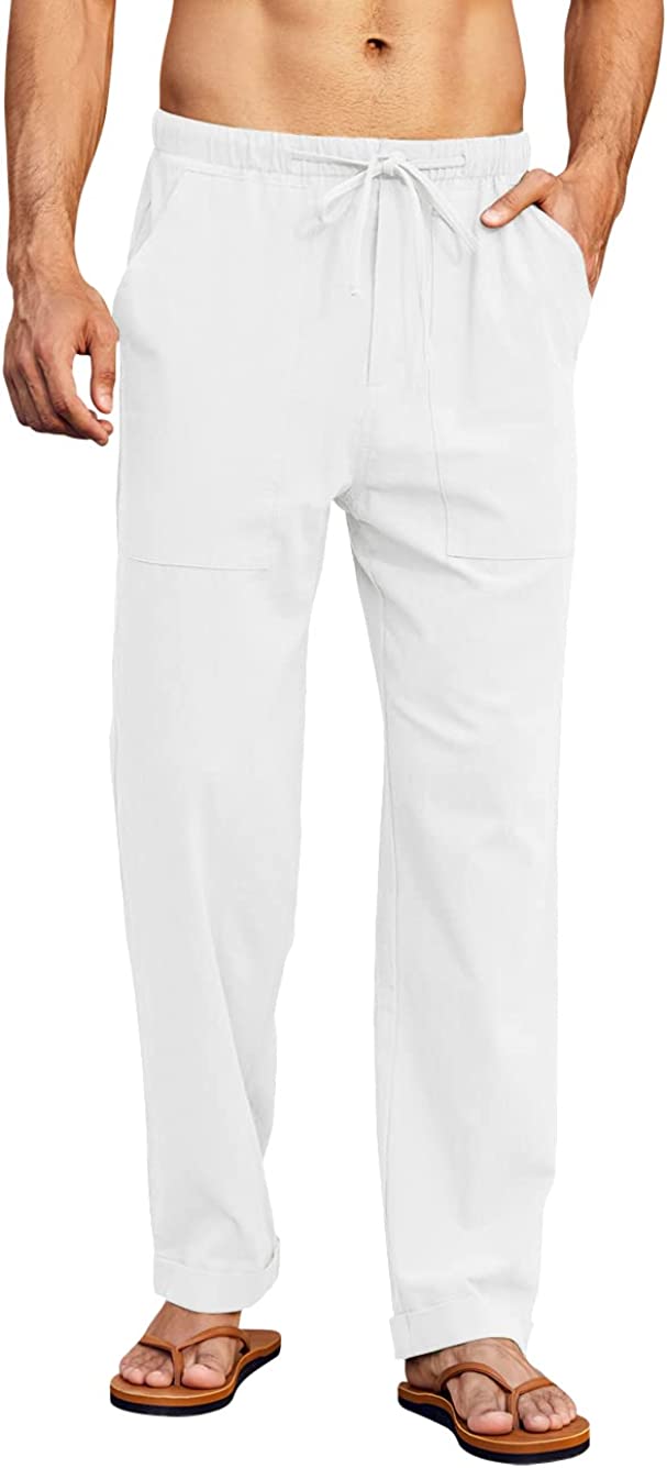 PASLTER Mens Casual Linen Pants Loose Fit Straight-Legs Elastic Drawstring Waist Summer Beach Yoga Long Pants