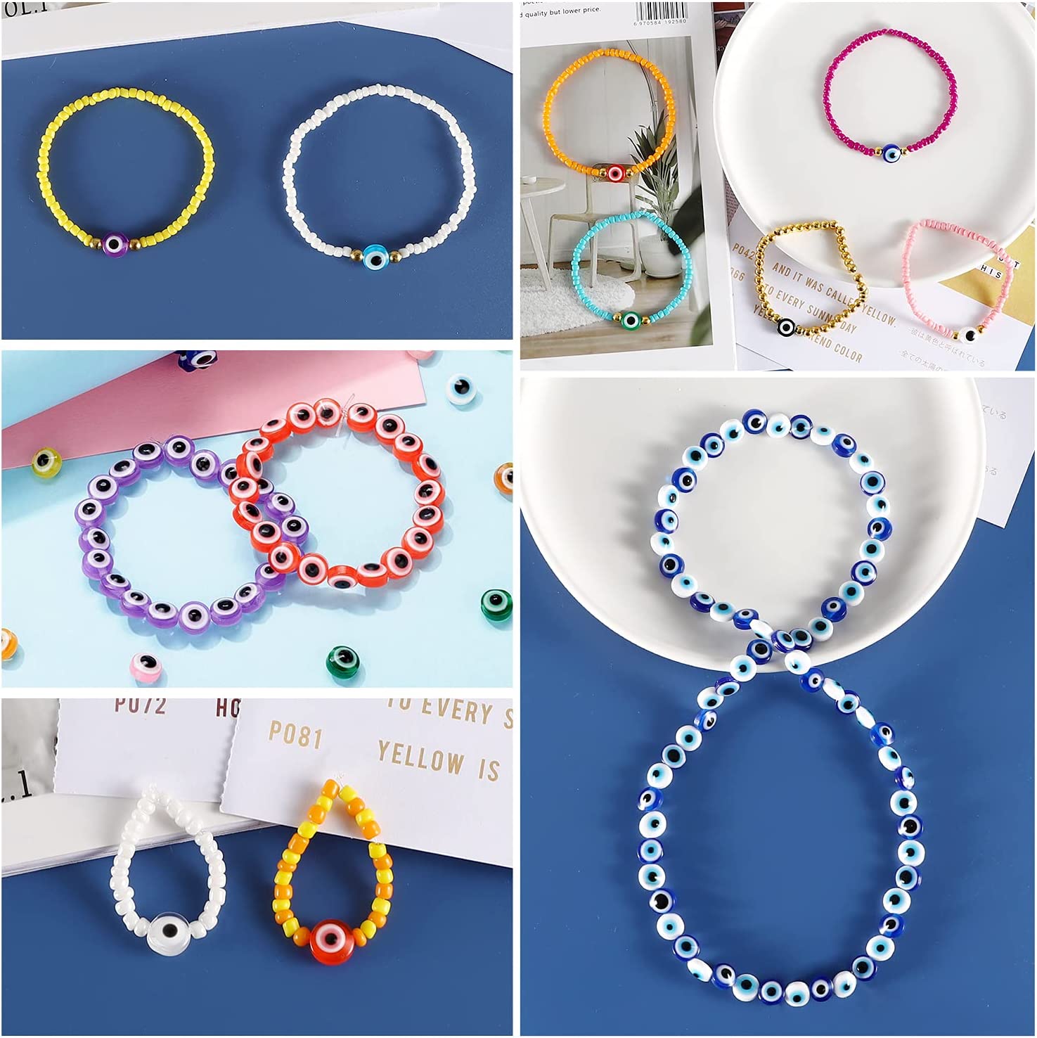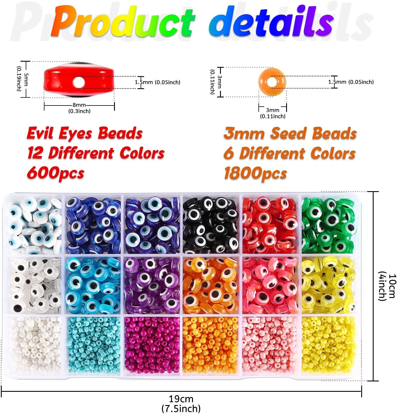 PHUNTTEK 2400pcs Seed Beads and Evil Eye Beads for Jewelry Making, 3mm Glass Seed Beads 8mm Flat Evil Eye Easter Beads Decors Colorful Bracelet Beads Kit for Bracelets Making DIY Beading Supplies
