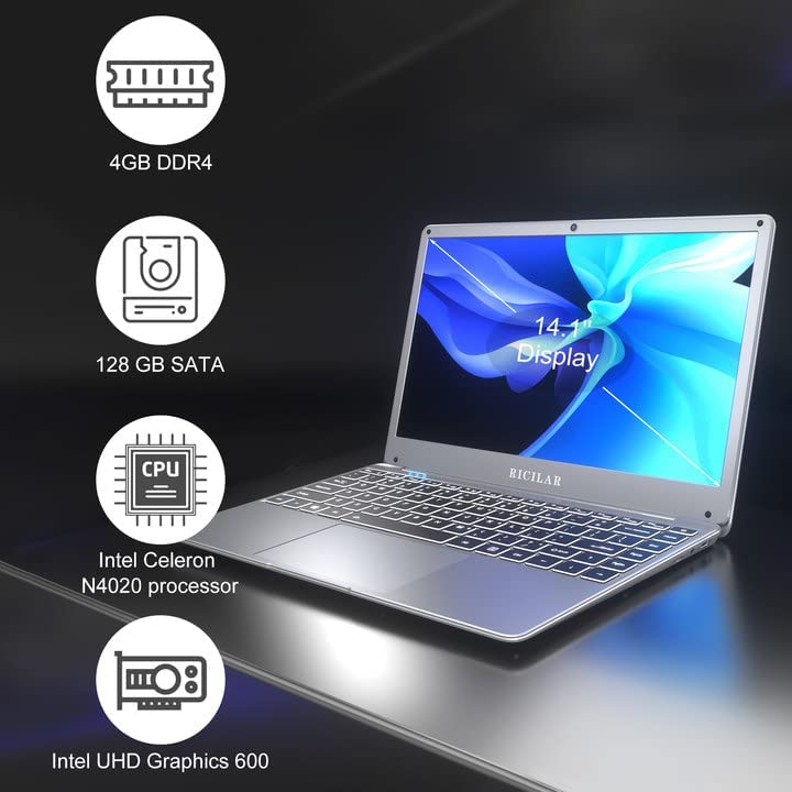 RICILAR Windows 10 Home Laptop, 14.1 Inch HD Display, Intel Celeron N4020, 4GB RAM, 128GB SSD, Backlit Keyboard, Type C, HDMI, Wi-Fi 5, Silver, School Laptop Computer for Students and Business