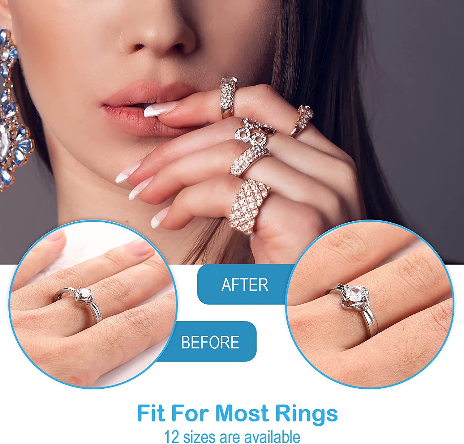 Ring Size Adjusters Set for Loosing Rings in 2 Styles, 12 Sizes, Ring Size Reducer Spacer Ring Guard Ring Resizer Tightener with Ring Sizer Measuring Belt, Jewelry Cloth and Organizer (16 Pieces)