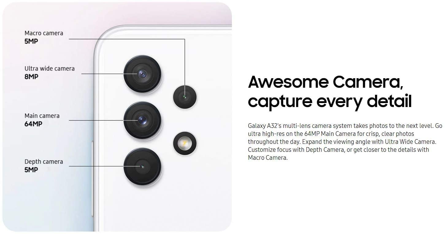 Awesome screen, real smooth scrolling: Feast your eyes on vibrant details with the FHD+ Super AMOLED display, reaching 800 nits for clarity even in bright daylight. Eye Comfort Shield lowers blue light, and 90Hz keeps the view smooth, whether you're gaming or scrolling. All on the expansive 16.21cm (6.4") Infinity-U Display. Awesome Camera, capture every detail: Galaxy A32's multi-lens camera system takes photos to the next level. Go ultra high-res on the 64MP Main Camera for crisp, clear photos throughout the day. Expand the viewing angle with Ultra Wide Camera. Customize focus with Depth Camera, or get closer to the details with Macro Camera. Awesome battery, lasts two days: The 5,000mAh (typical) battery gives you more time to do what you love—streaming, sharing, gaming and more. AI power management detects and adjusts to your mobile usage habits for long-lasting power. And with up to 15W of Adaptive Fast Charging, Galaxy A32 gets back to full power, quickly. Awesome performance to do more at once: Whether you're focused on one task or multiple tasks at once, Galaxy A32 delivers a big boost in performance thanks to an advanced Octa-core processor and up to 4GB of RAM. Store more and delete less with 128GB internal storage. If that's not enough, add up to 1TB with microSD card.