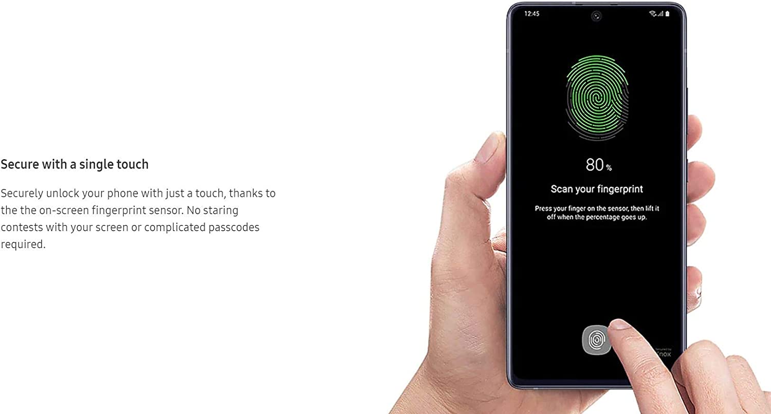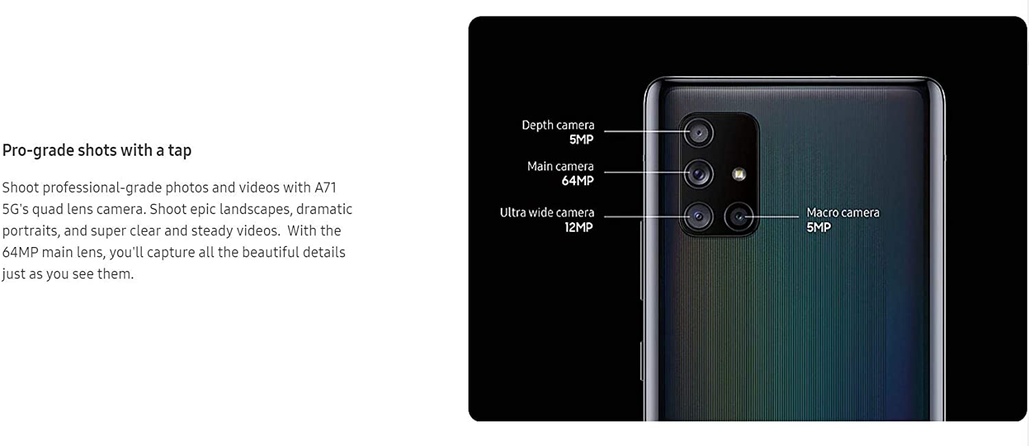 Galaxy 5G for everyone5G networks are taking device speeds to mind-blowing new heights, and it’s never been a better time to explore the possibilities. With Galaxy 5G, your phone can download 4K movies in a matter of seconds. Enjoy seamless, real-time connectivity and leave lag times in the dust. Bigger. Brighter. Bolder.Exquisite clarity and rich detail leap off this massive 6.7” Super AMOLED+ Infinity Display.³ Its edge-to-edge screen becomes saturated with color and dramatic contrast, elevating your entertainment to the next level. Power to keep goingScroll, snap and share more with a long lasting, fast charging battery. Smooth, stable shotsYou can take remarkably crisp, ultra HD quality video of fast-moving action while you're moving. Its stability function makes photos and videos look super smooth with minimal blur. Store moreStore even more photos and apps without worry. You can expand the 128GB base storage up to 1TB with a microSD card. Secure with a single touchSecurely unlock your phone with just a touch, thanks to the the on-screen fingerprint sensor. No staring contests with your screen or complicated passcodes required. Pro-grade shots with a tapShoot professional-grade photos and videos with A71 5G's quad lens camera. Shoot epic landscapes, dramatic portraits, and super clear and steady videos. With the 64MP main lens, you'll capture all the beautiful details just as you see them.