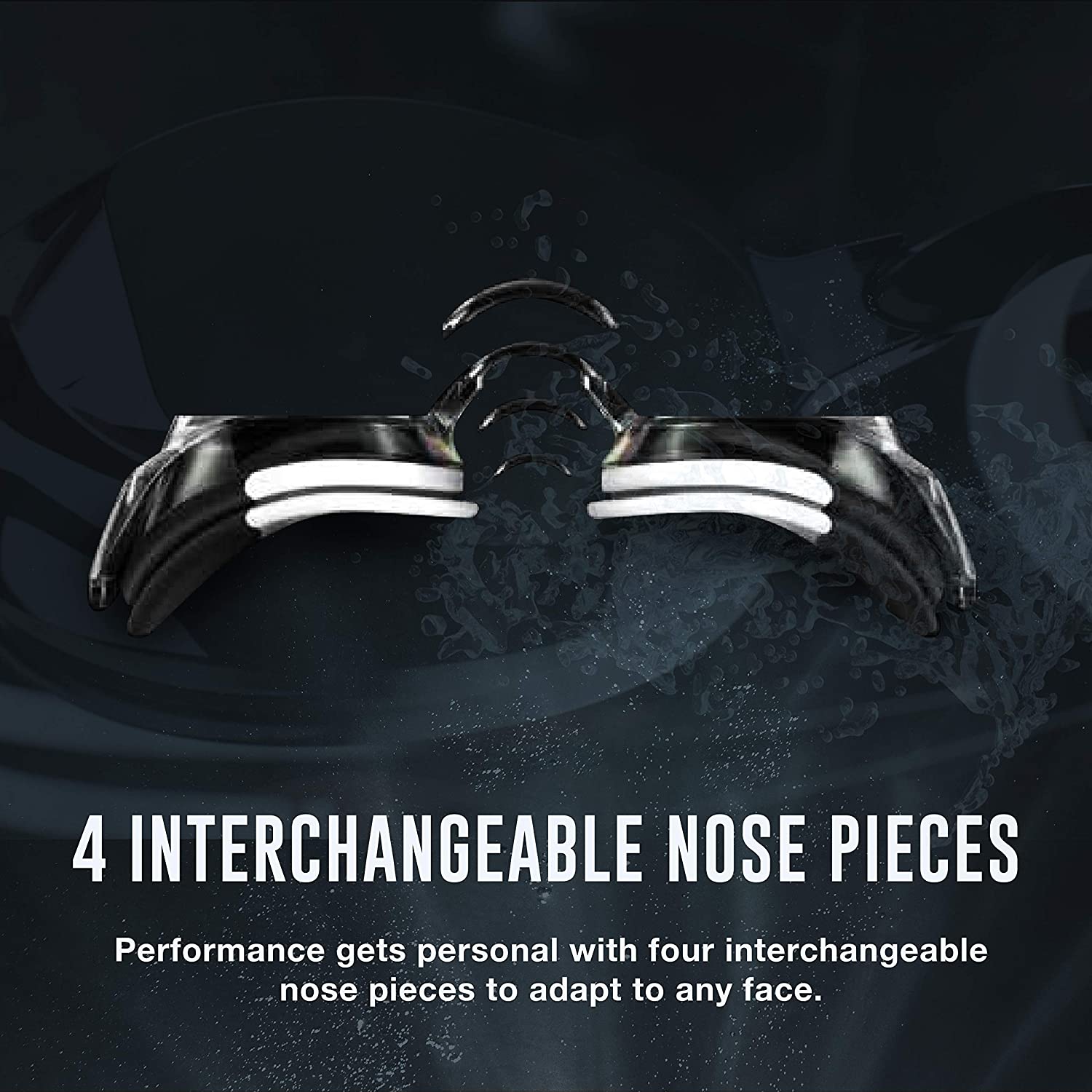 Unchanged classic fit with soft silicone eye seals. Two-tone silicone double headstrap and ergonomic adjustable clip. Mirrored lens coating helps to reduce glare. Features three interchangeable nose pieces. UV protection. Anti-fog. 100% PVC free. Latex free.