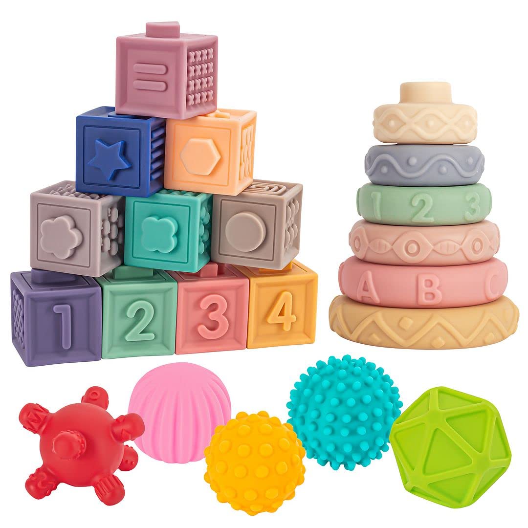 Springflower 3 in 1 Montessori Toys for Babies 0-3-6-12 Months, Soft Baby Teething Toys, Stacking Building Blocks for Infants, Sensory Developmental Education Toys for Toddler Baby 12-18 Months,23 PCS