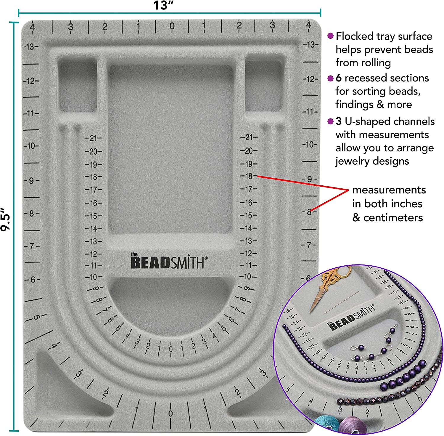 The Beadsmith Bead Board, Grey Flocked, 3 U-Shaped Channels, 6 Recessed Compartments, 9.5 x 13 inches, Design Boards for Creating Bracelets, Necklaces and Other Jewelry