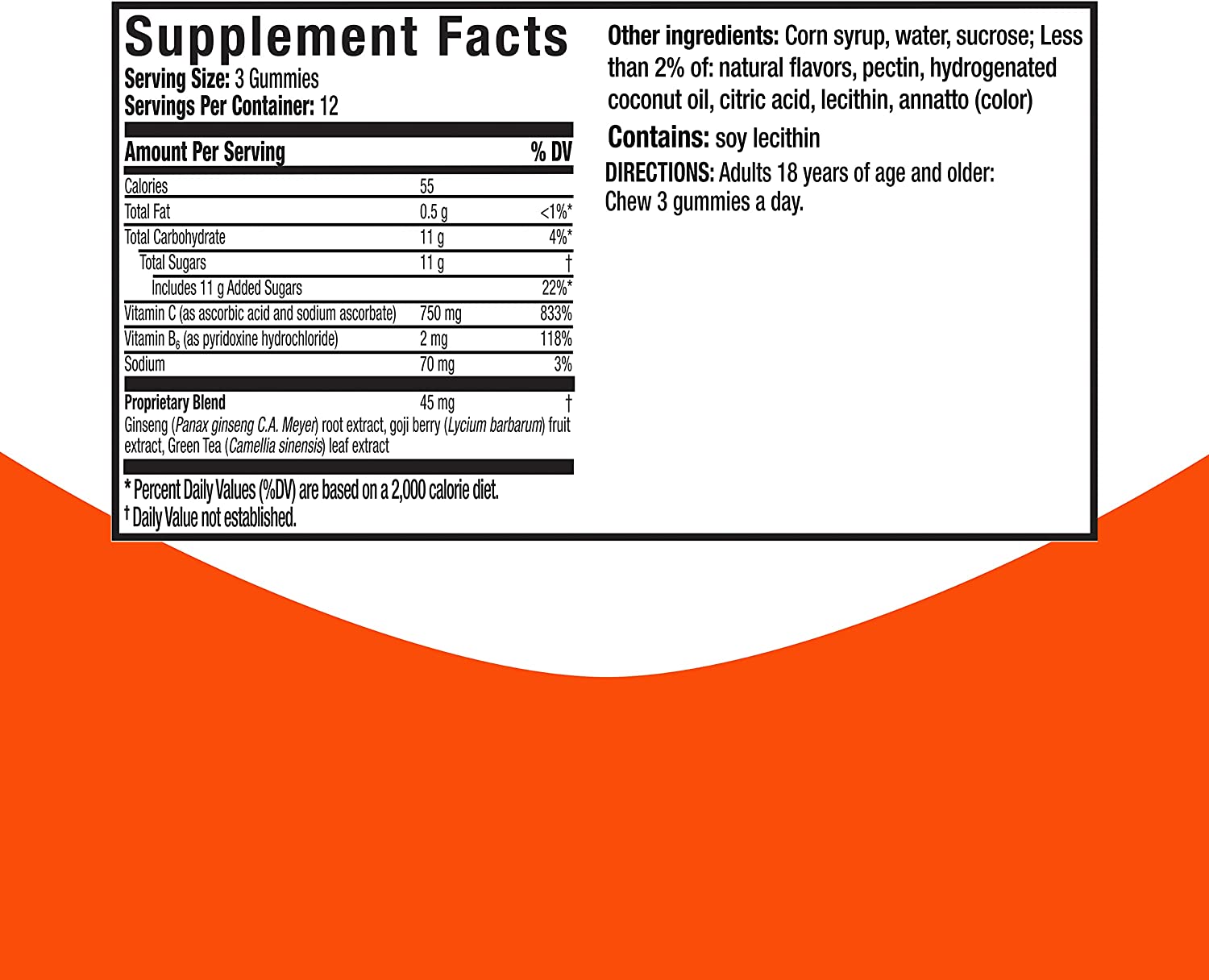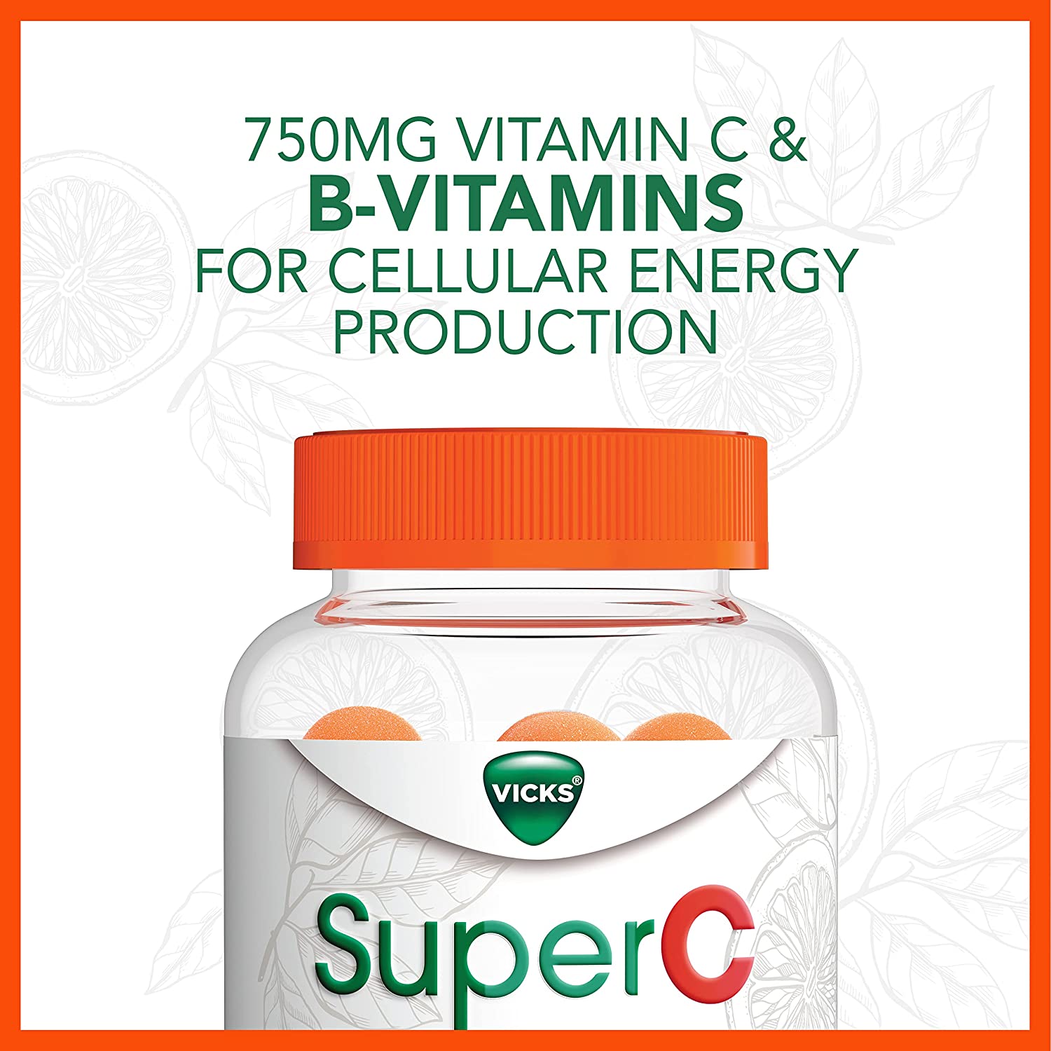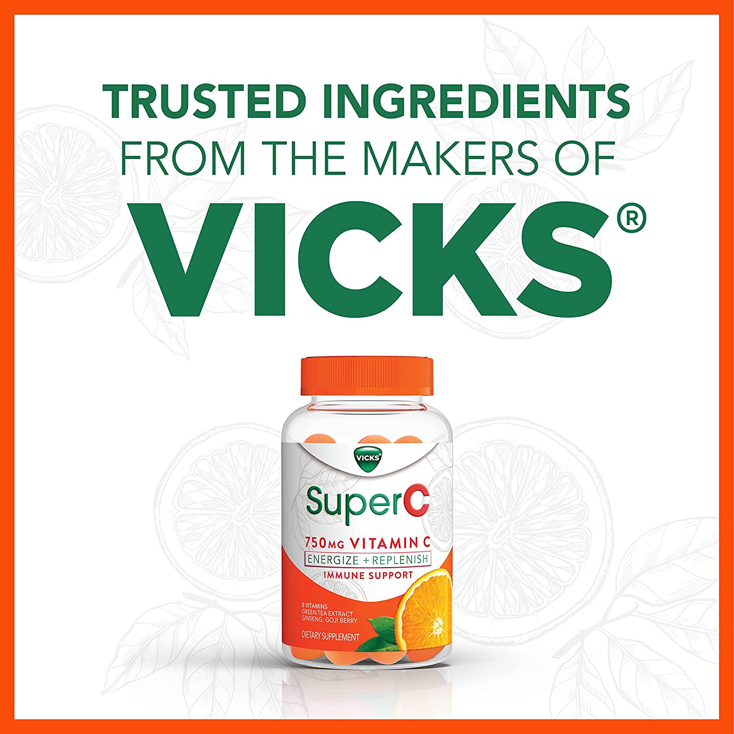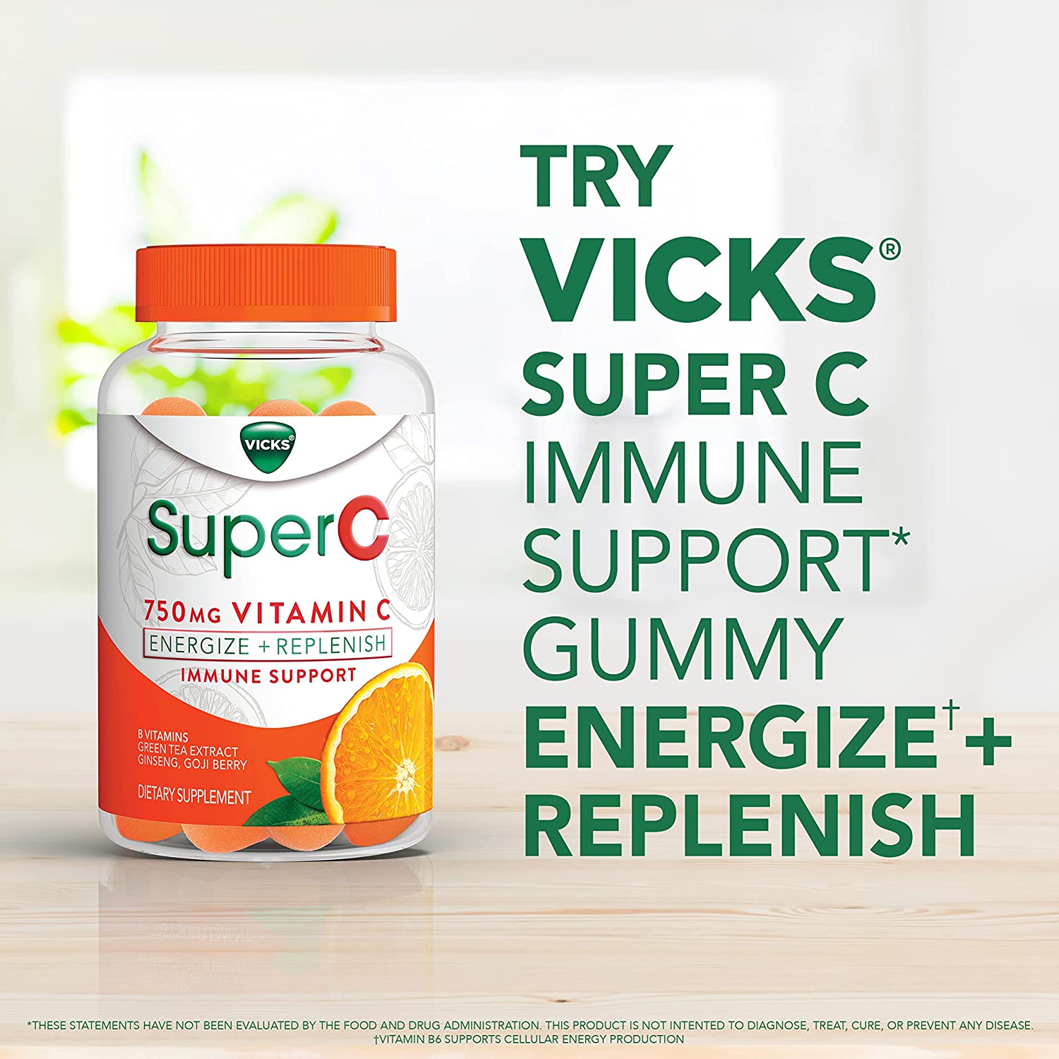 Feel ready to take on your day with Vicks Super C Gummies. Vicks Super C Energize + Replenish* Daily gummies are effective daytime immune system support from the makers of Vicks, expertly formulated to help you Energize** + Replenish*. Each dose of Vicks Super C Energize + Replenish* gummies contains 750mg Vitamin C for immune system support* day or night and Vitamin B6 for cellular energy. Vicks Super C also contains a proprietary herbal blend of botanicals including Ginseng, Green Tea and superfruit Goji Berry. Vicks SuperC gummies come in a great-tasting citrus flavor you'll love and are great for daily, all year-round use. Support your immune system* with Vicks Super C gummies. Vicks has been trusted for over 125 years. Vicks Super C is not intended to treat cold or flu. *These statements have not been evaluated by the Food and Drug Administration. This product is not intended to diagnose, treat, cure, or prevent any disease. **Vitamin B6 supports cellular energy production