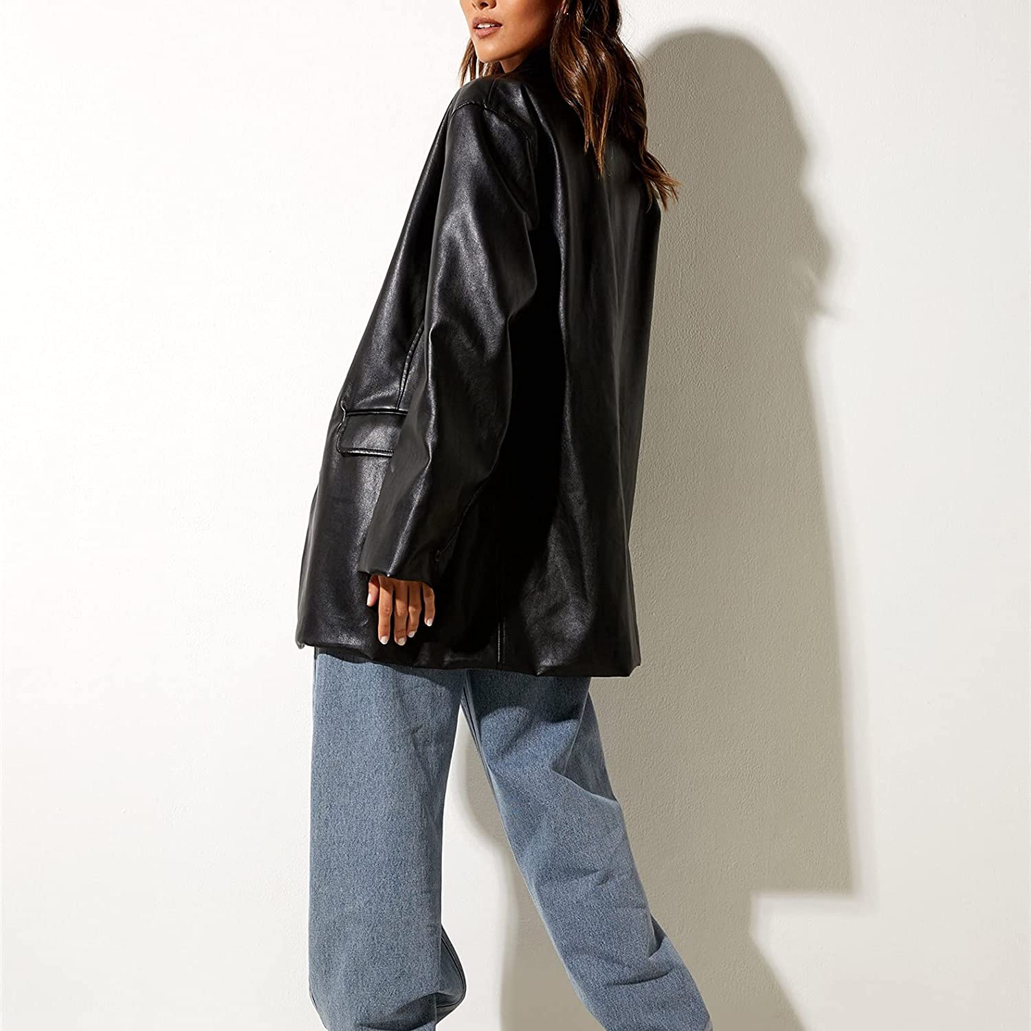 Women Casual Faux Leather Blazer Long Sleeve Button Down Y2K PU Leather Jacket with Pocket