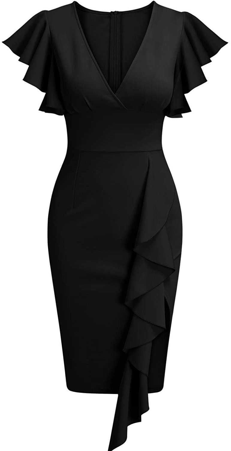 Women's Deep-V Neck Ruffle Sleeves Cocktail Party Pencil Slit Formal Dress