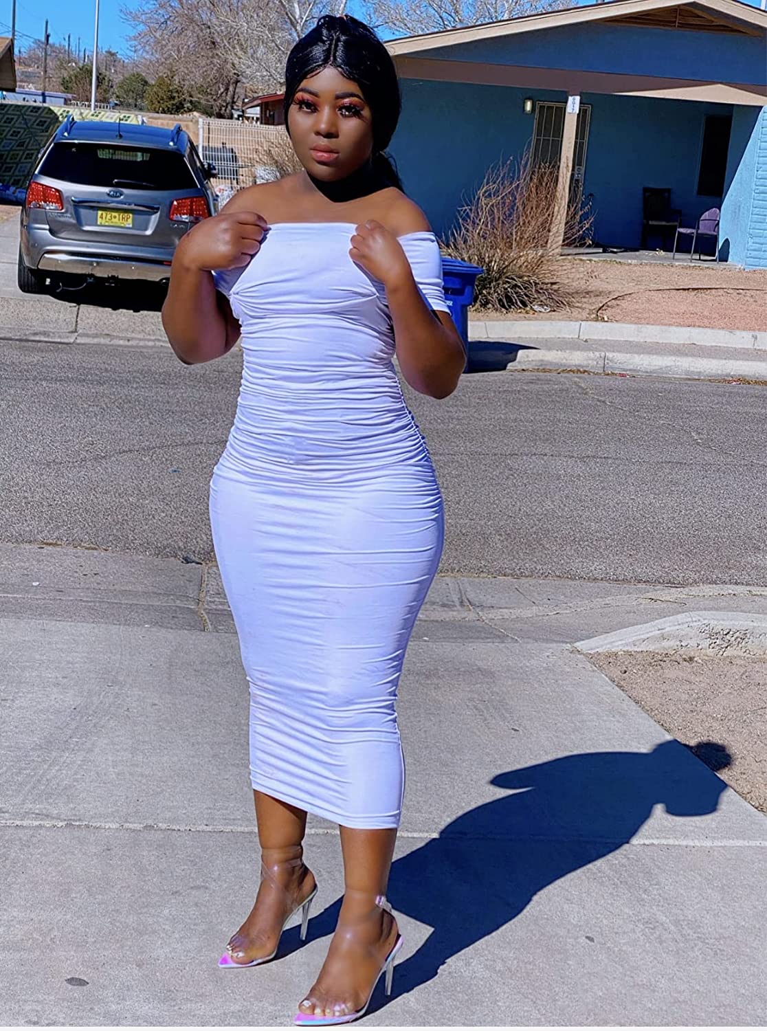 Women's Ruched Off Shoulder Short Sleeve Bodycon Midi Elegant Cocktail Party Dress