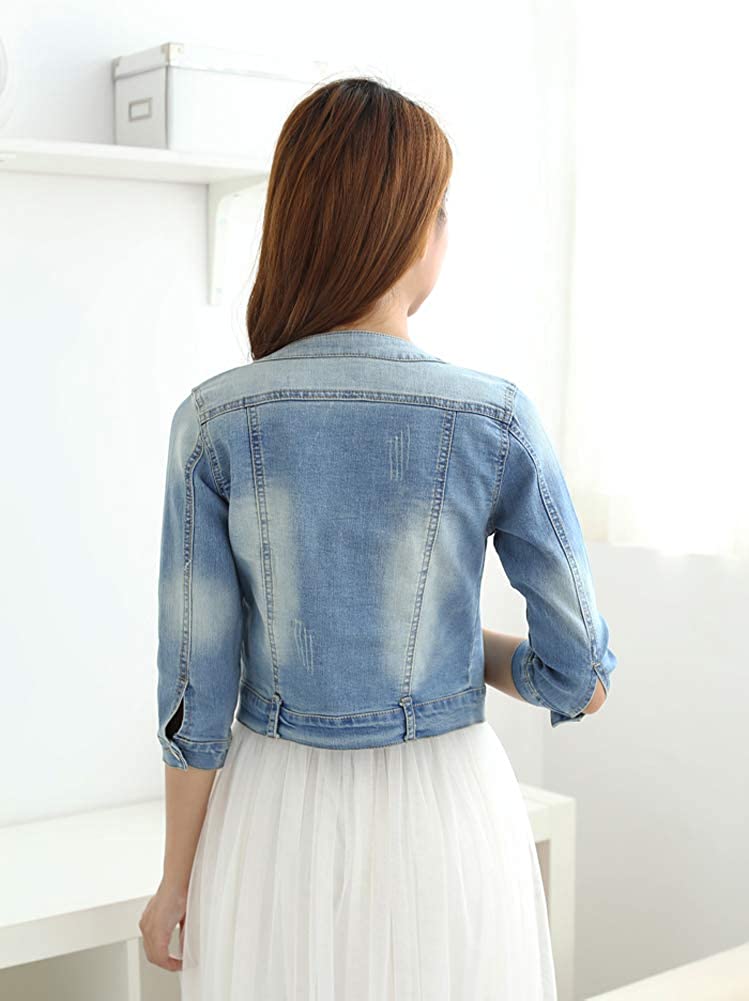 Women's Short Denim Jacket Round Neck Denim Three Quarter Sleeves Light Blue Jacket