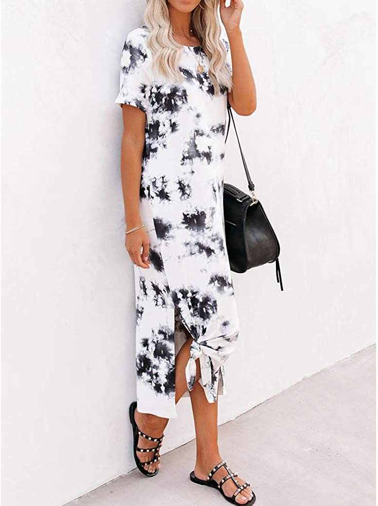 Women's Short Sleeve Split Maxi Dress Casual Plain Tie Dye Print Tshirt Long Dresses with Pockets