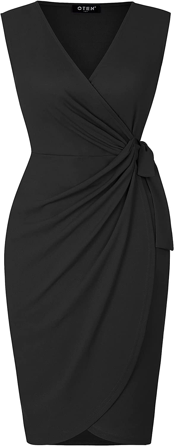 Womens Sleeveless Deep V Neck Sheath Knee Length Cocktail Party Work Faux Wrap Formal Dress