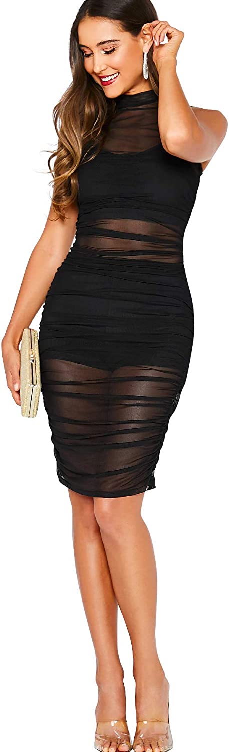 Women's Sleeveless Mesh Sheer Bodycon Overlay Club Party Ruched Tank Dress