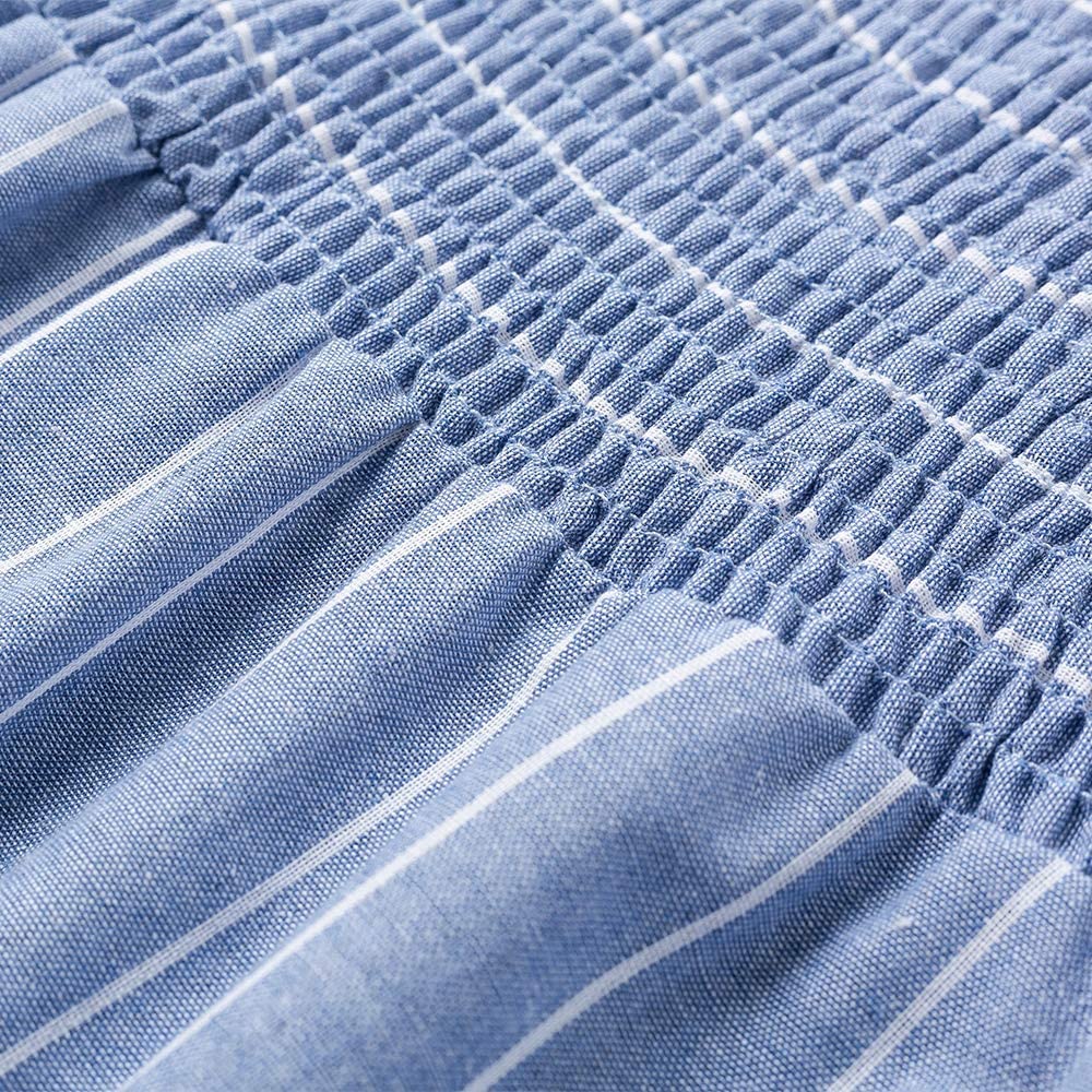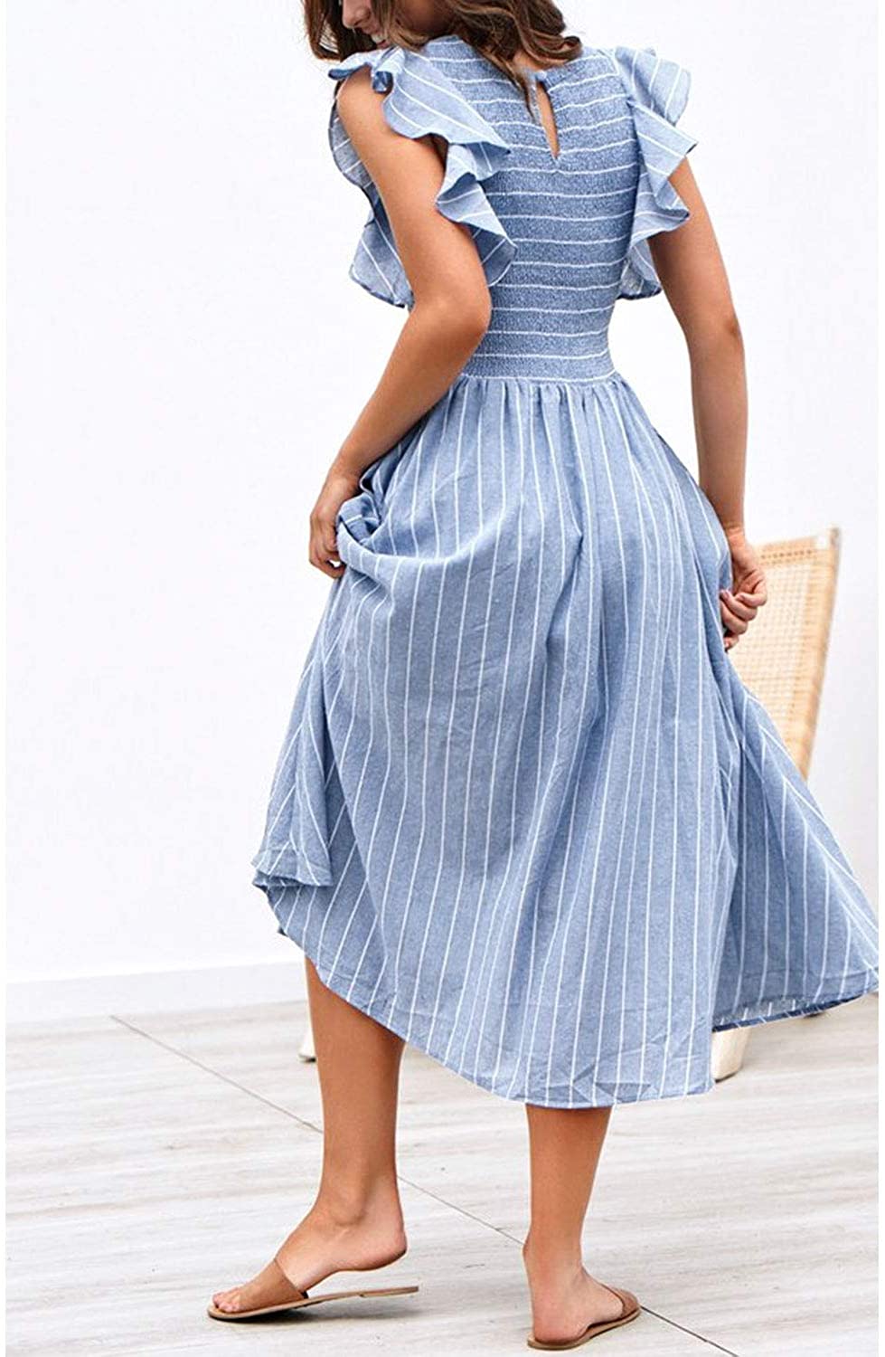 Women's Striped Linen Long Dress Elegant Ruffle Cap Sleeves Midi Dress