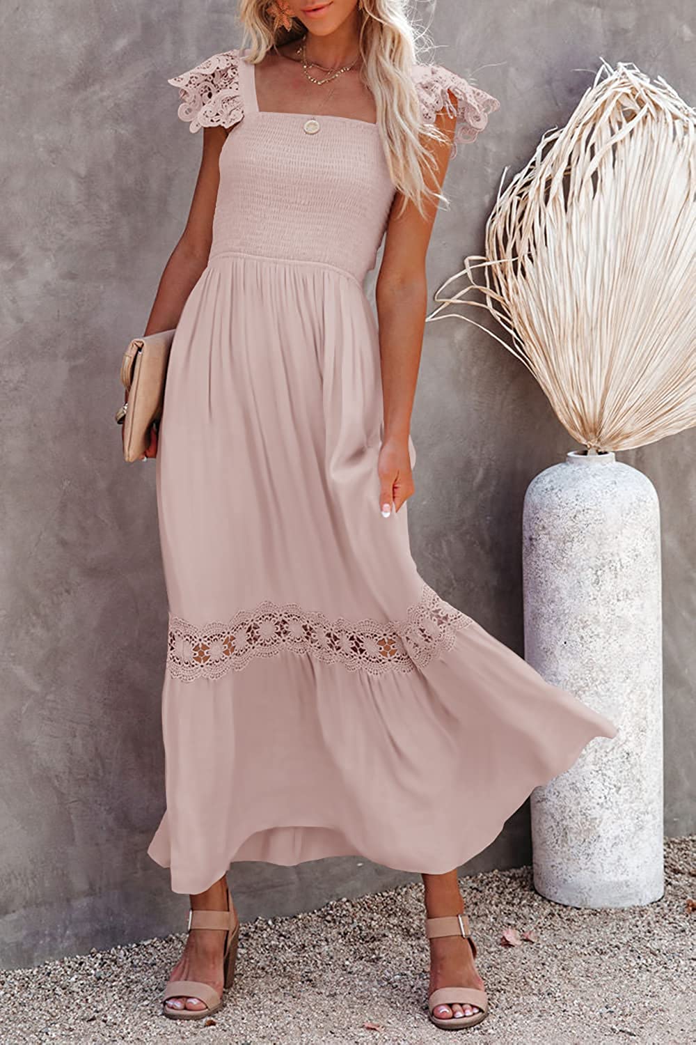Womens Summer Boho Lace Strap Sleeveless Square Neck Ruffle A Line Flowy Beach Long Maxi Dress with Pockets