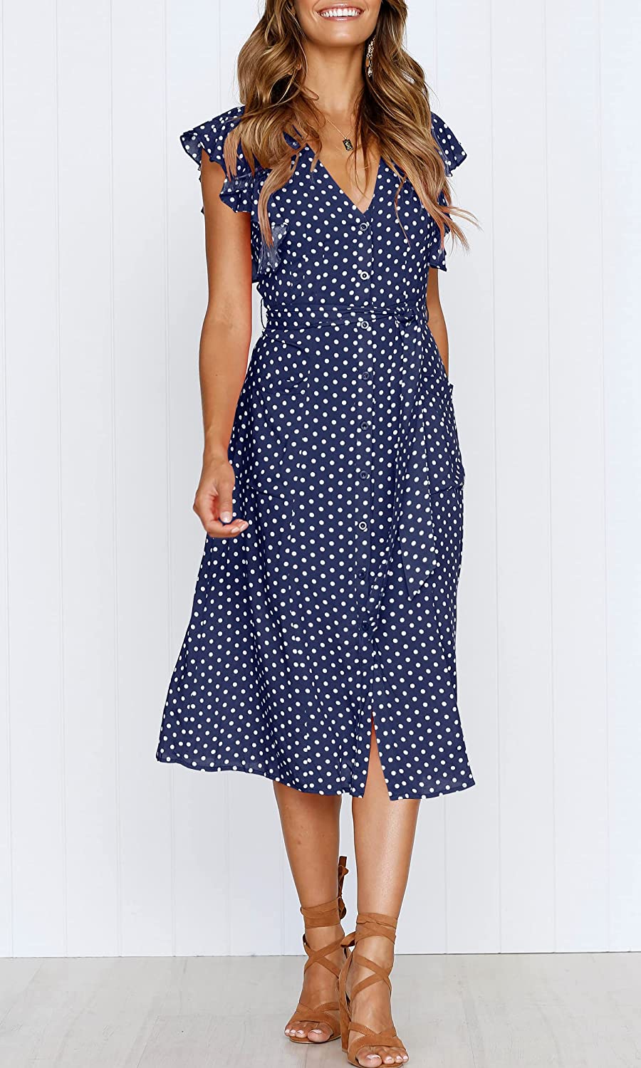 Women's Summer Boho Polka Dot Sleeveless V Neck Swing Midi Dress with Pockets
