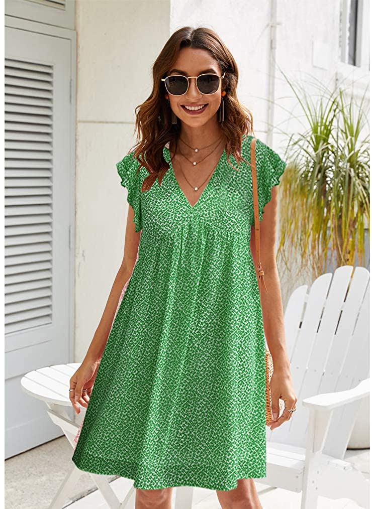 Women's Summer Casual Dress V Neck Ruffle Sleeve Loose Flowy Swing Shift Mini Dress