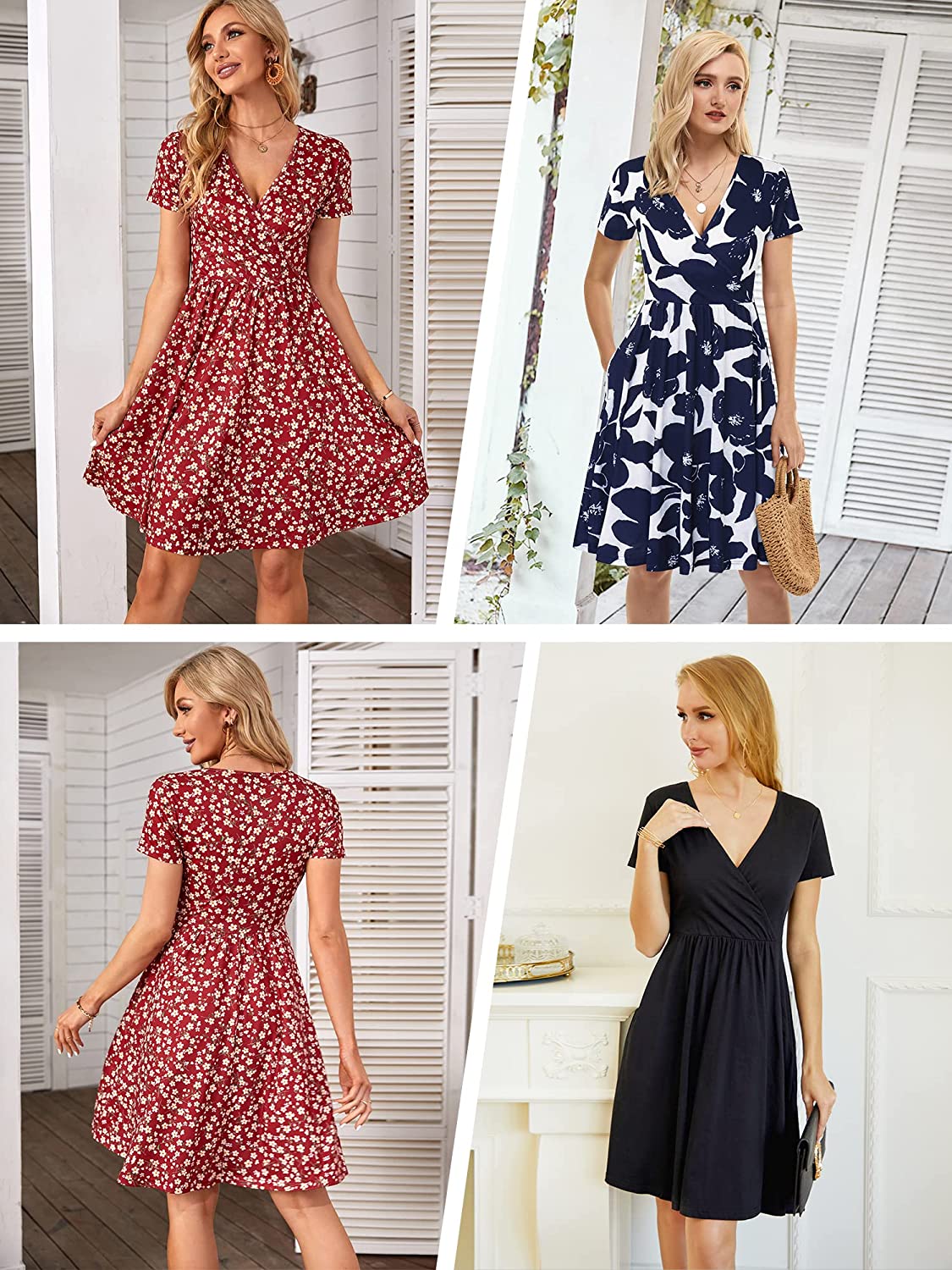 Women's Summer Casual Short Sleeve Wrap V Neck Floral Dress with Pockets