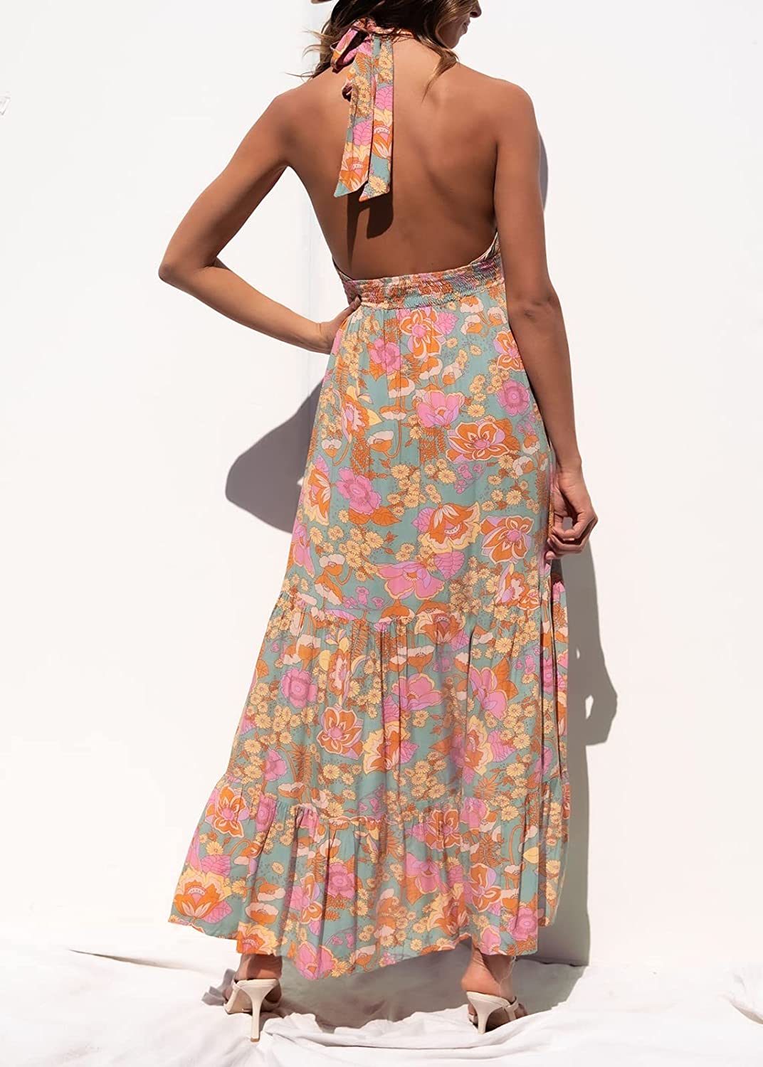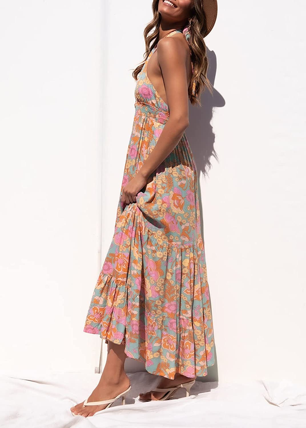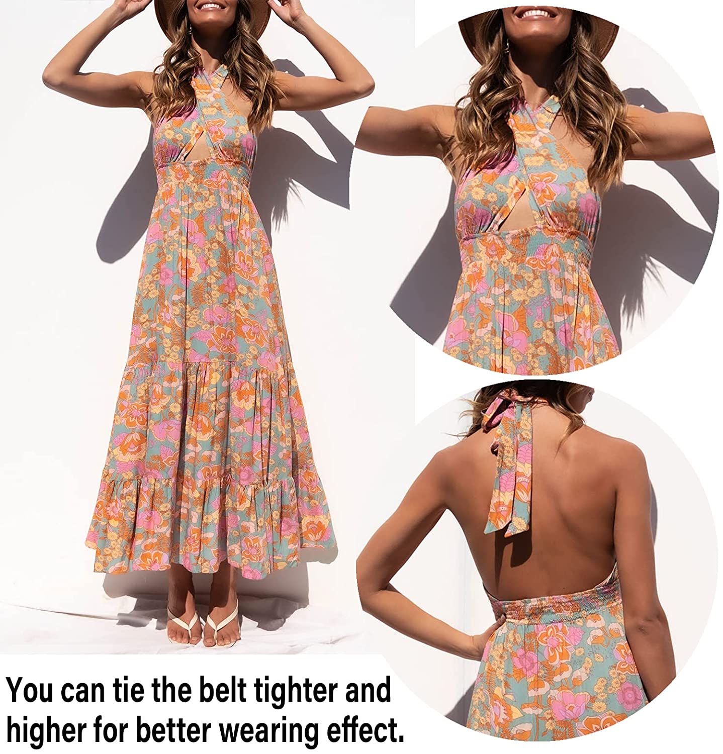 Women's Summer Crossover Halter Neck Sleeveless Plaid Cut Out Backless Flowy A Line Maxi Dress