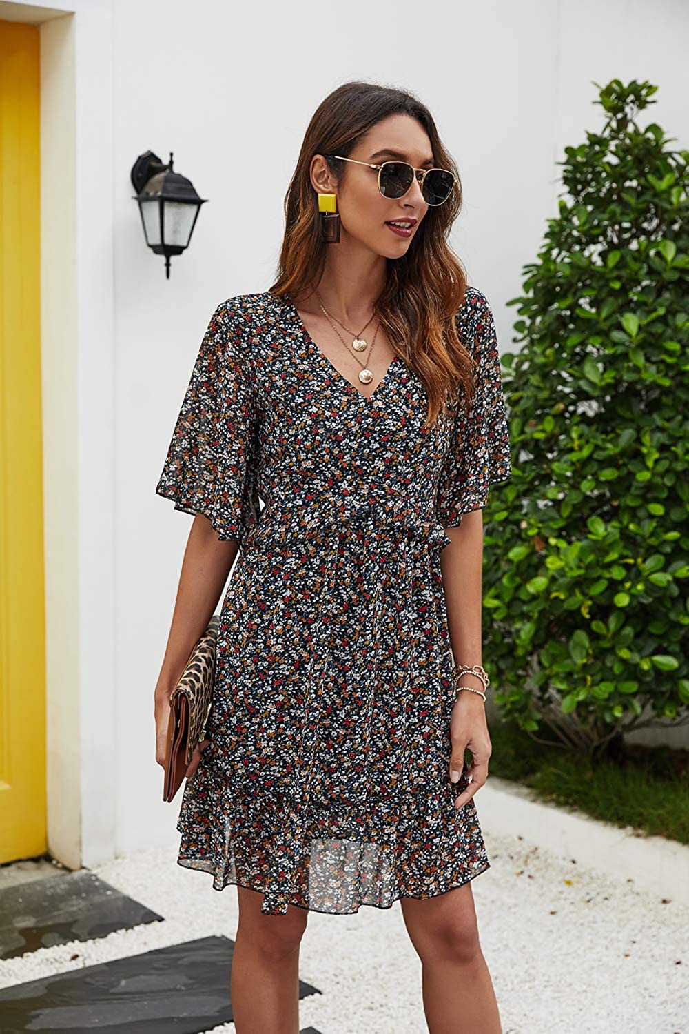 Women's Summer Floral Print V Neck Casual Mini Boho Ruffle Swing Dress MY068