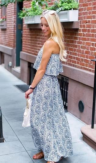Women's Summer Off The Shoulder Maxi Dress Ruffle Strapless Blue White Porcelain Boho Casual Loose Long Dress