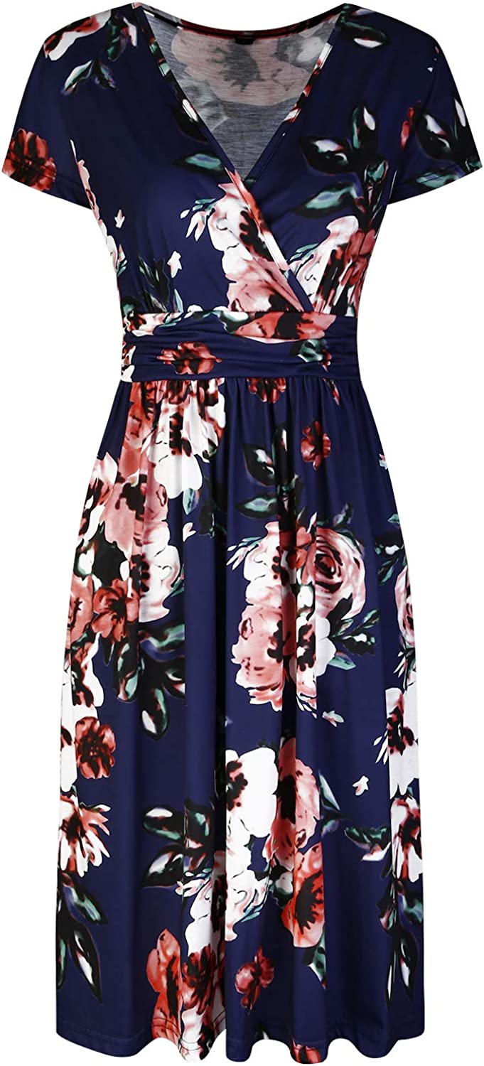 Women's Summer Short Sleeve V-Neck Floral Short Party Dress with Pockets