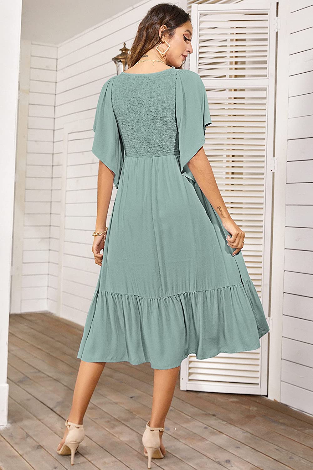 Women's Summer Tiered Dress Smocked Flutter Short Sleeve V Neck Midi Dresses