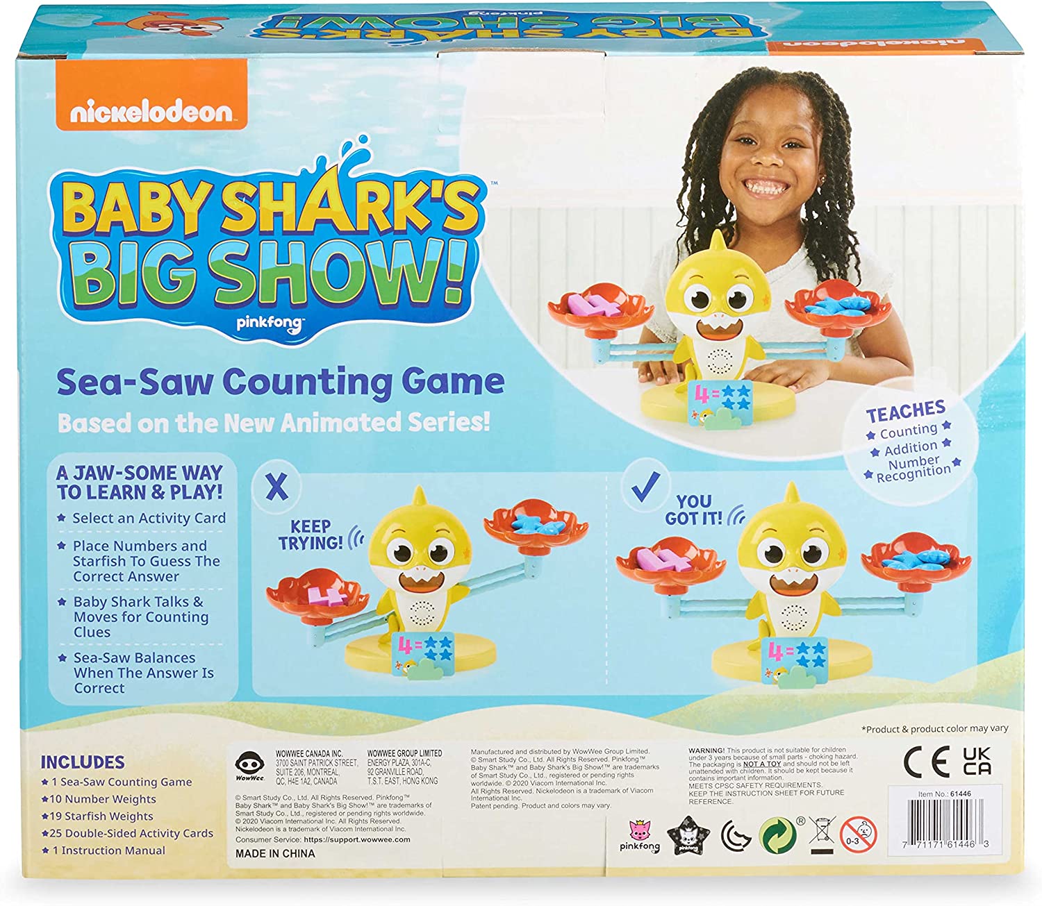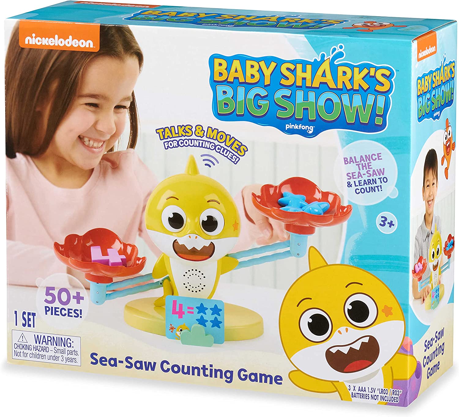 Balance the sea-saw and learn to count with Baby Shark! Based on Nickelodeon’s animated preschool series, Baby Shark’s Big Show!, the Sea-Saw Counting Game is a fun and interactive way for little ones to learn basic math. Kids select an activity card with a beginner, intermediate or advanced sea-saw counting challenge. To solve the challenge, they have to place number weights and starfish weights on both sides of the sea-saw according to the pictures on the card. As weights are added, Baby Shark talks and moves for counting clues. When they arrive at the correct answer, the sea-saw balances and Baby Shark says different encouraging reactions and expressions. The Sea-Saw Counting Game provides a jaw-some way to learn and play and teaches counting, addition, and number recognition. This educational toy features 50+ pieces, including an interactive Baby Shark sea-saw, 10 number weights, 19 starfish weights and 25 double-sided activity cards. For boys and girls ages 3 and older.