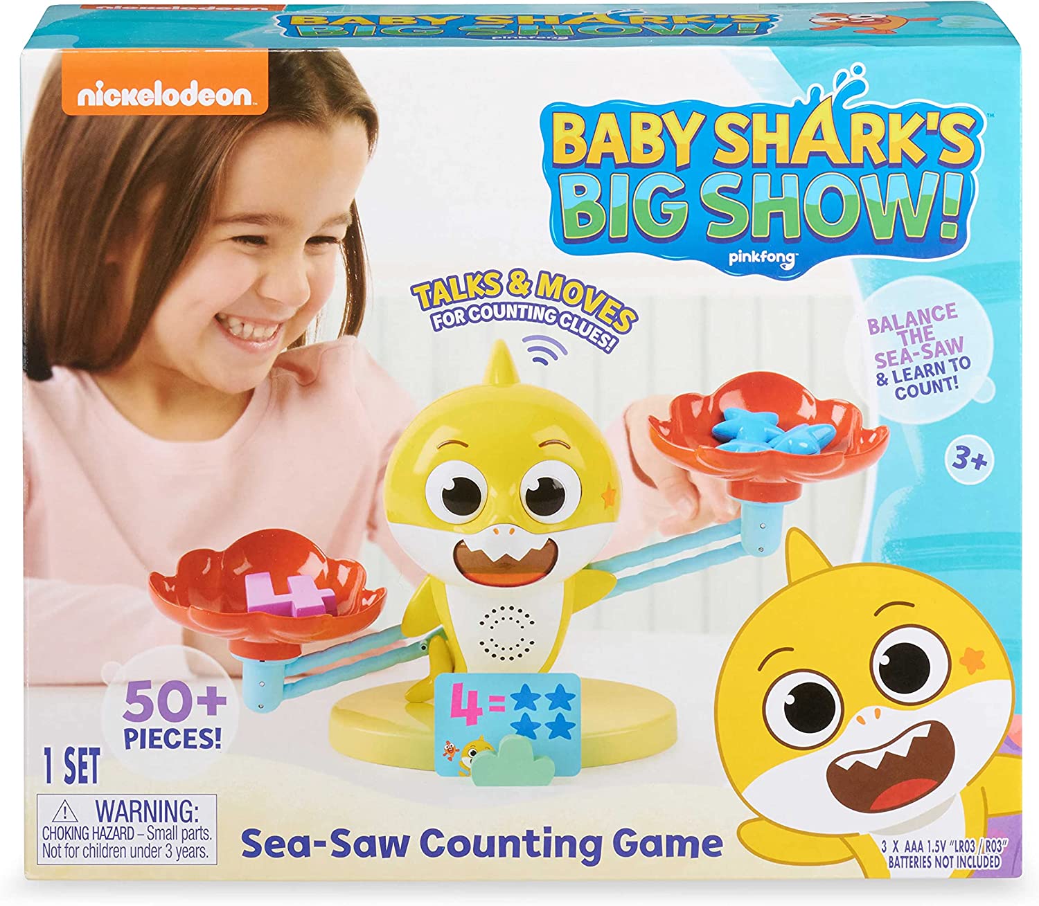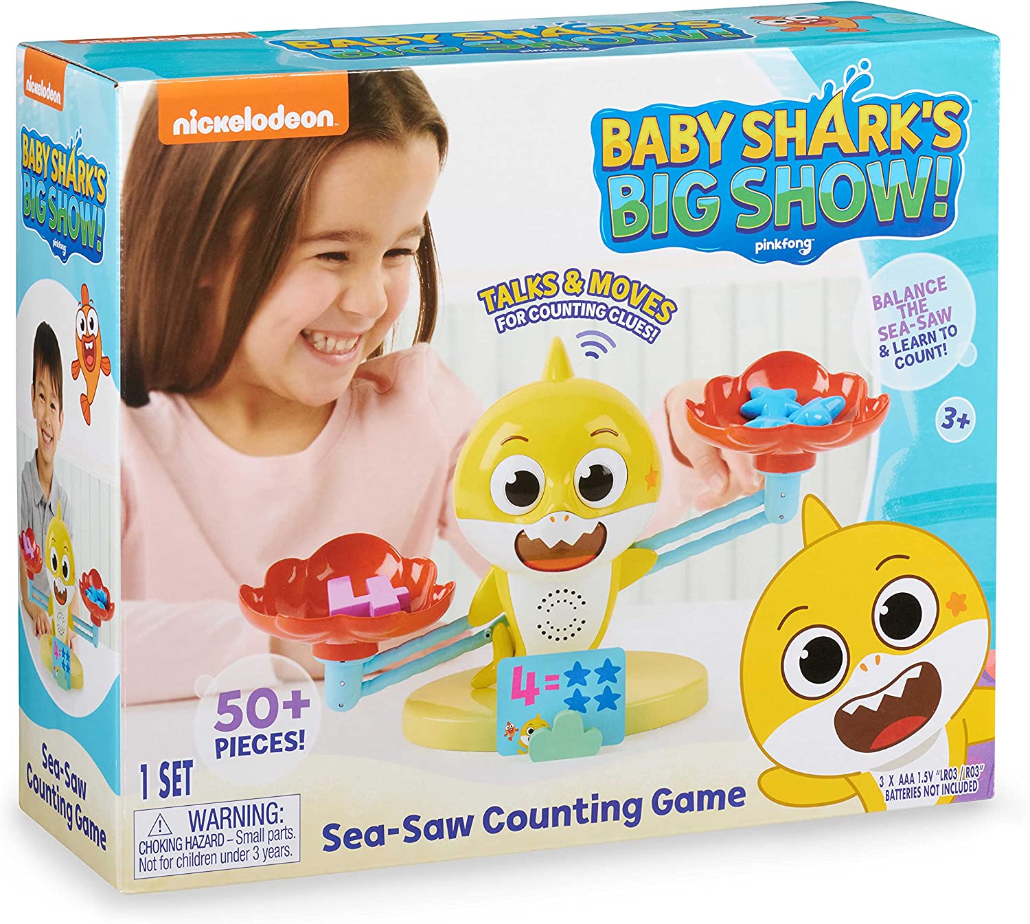 Balance the sea-saw and learn to count with Baby Shark! Based on Nickelodeon’s animated preschool series, Baby Shark’s Big Show!, the Sea-Saw Counting Game is a fun and interactive way for little ones to learn basic math. Kids select an activity card with a beginner, intermediate or advanced sea-saw counting challenge. To solve the challenge, they have to place number weights and starfish weights on both sides of the sea-saw according to the pictures on the card. As weights are added, Baby Shark talks and moves for counting clues. When they arrive at the correct answer, the sea-saw balances and Baby Shark says different encouraging reactions and expressions. The Sea-Saw Counting Game provides a jaw-some way to learn and play and teaches counting, addition, and number recognition. This educational toy features 50+ pieces, including an interactive Baby Shark sea-saw, 10 number weights, 19 starfish weights and 25 double-sided activity cards. For boys and girls ages 3 and older.