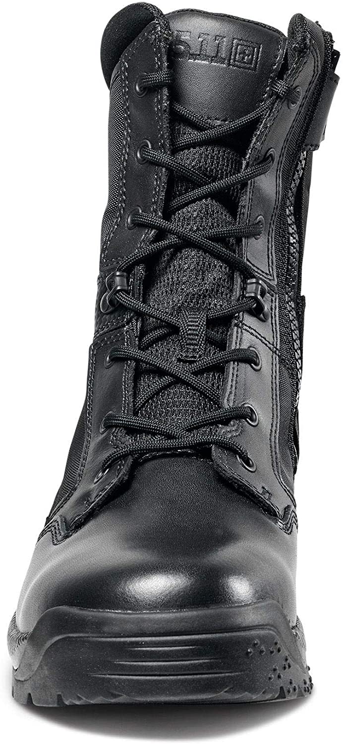 The boot worn by the world's leading public safety Personnel, the 5.11 A.T.A.C., just got promoted. It's lighter and more comfortable, yet maintains its reputation for toughness and durability. A new air flow tongue and full-length dual durometer ortholite footbed work to keep your feet cool, dry and comfortable all day, every day. Another new feature, The achilles heel flex zone, gives a critical part of your foot more range of motion without compromising support. The full-grain leather toe, 840D nylon upper and shock Mitigation System provide the kind of rugged protection you need; while the knife pocket keeps an important ally within reach.