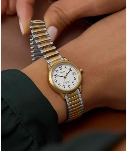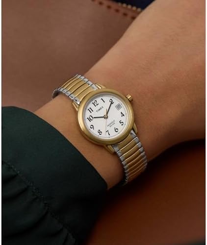 Easy to Read Dial: White dial with full Arabic numerals and a convenient date window at 3 o’clock for quick, effortless time viewing Comfortable Expansion Band: Two-tone 12mm stainless steel expansion band designed to fit 6-to-7.5-inch wrist circumference with easy slip-on comfort INDIGLO Backlight: INDIGLO night light allows you to tell the time in the dark with the push of a button Simplicity and Effortless Style: Two-tone 25mm brass case paired with a durable mineral glass crystal for a polished everyday look Water Resistant to 30 Meters