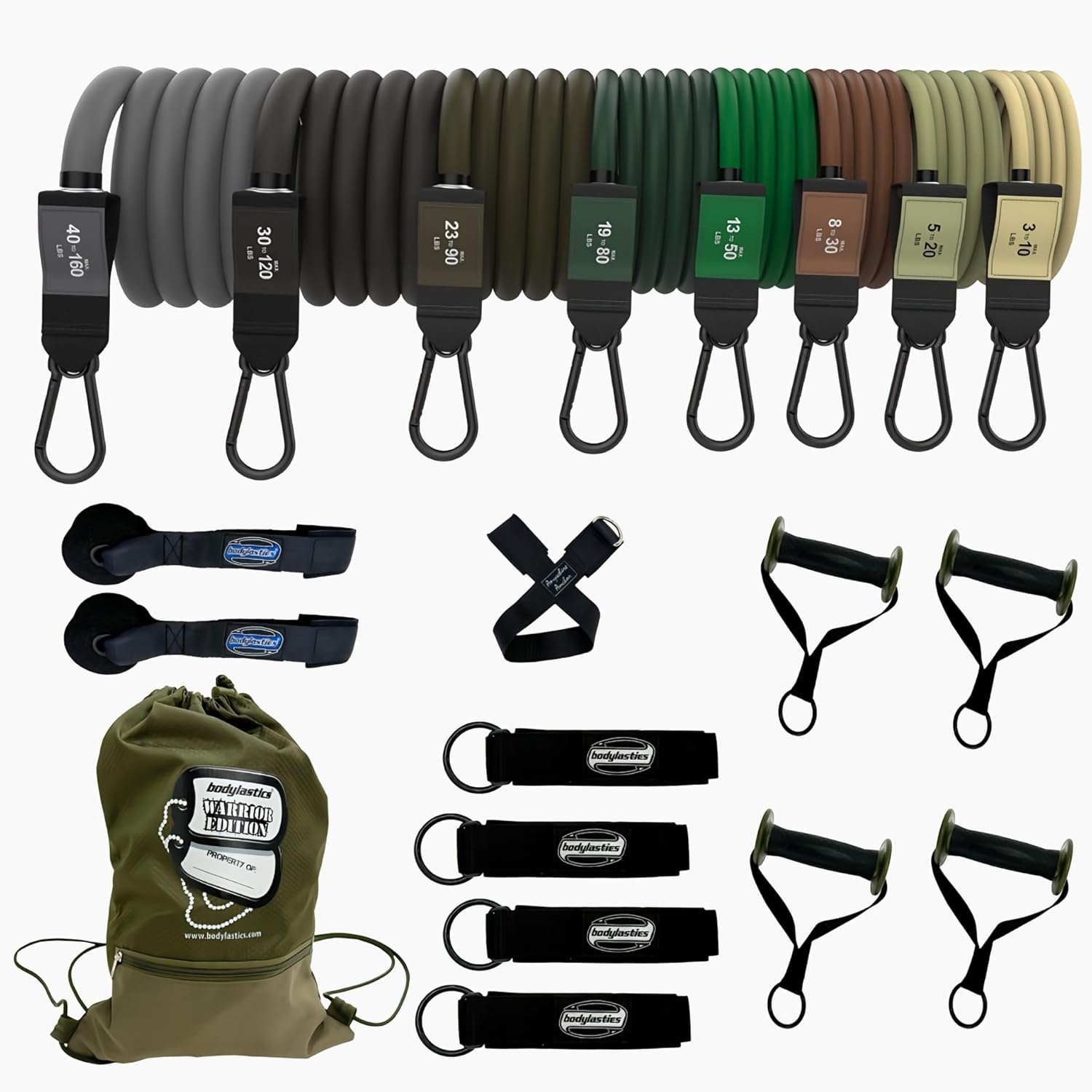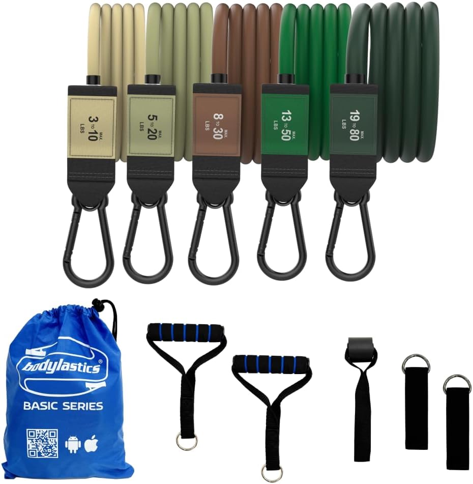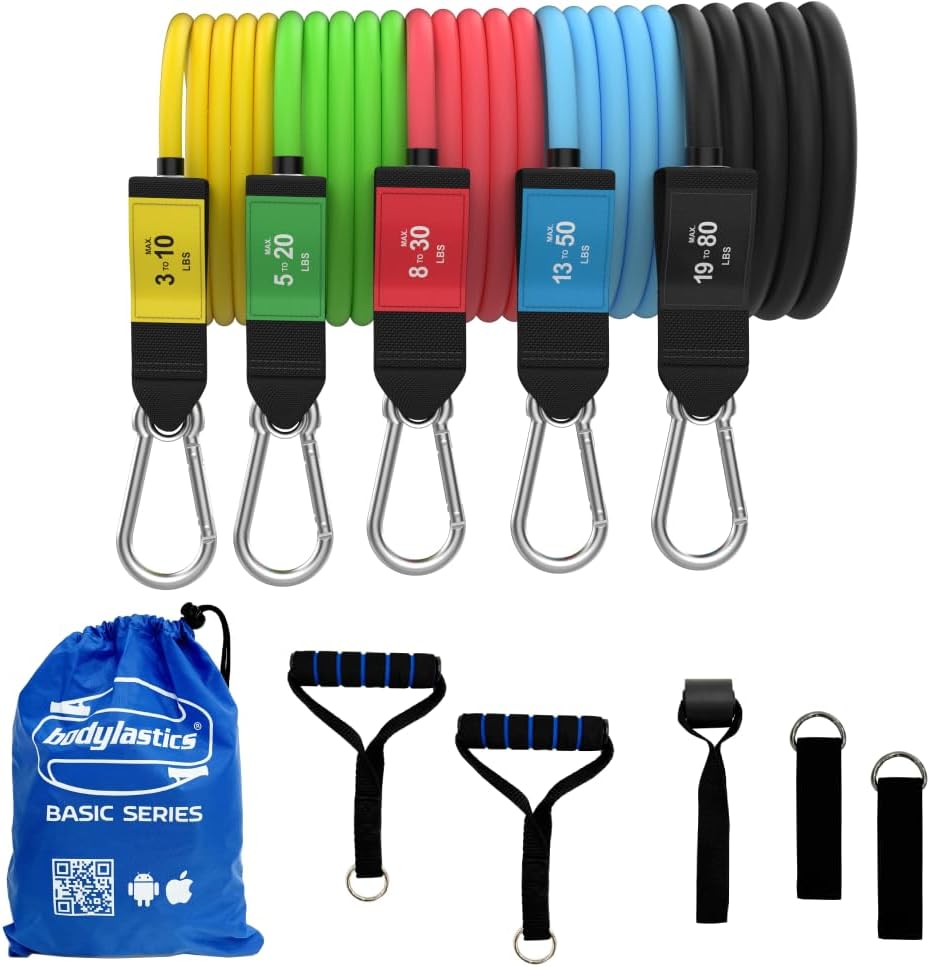 Bodylastics Patented Basic Series Resistance Band Set - 5 Resistance Bands (46 Inch each vs PRO Series 54 Inch) , 2 Handles, 2 Ankle Straps, 1 Door Anchor, Carry Bag - Snap Reduction Tech