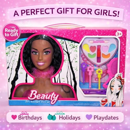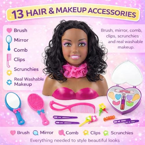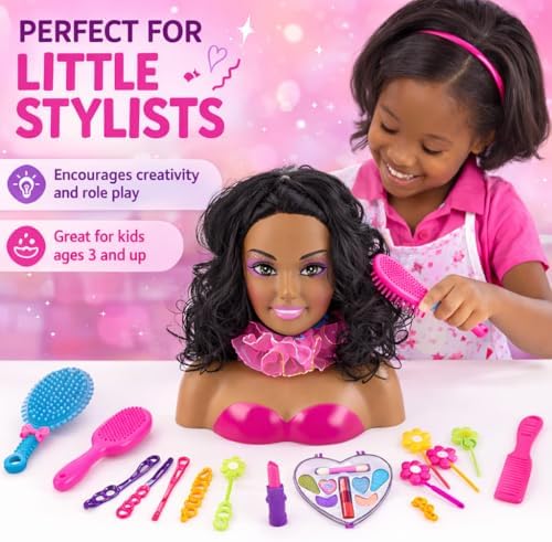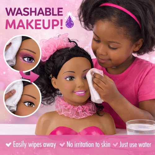Liberty Imports African American Black Makeup and Hair Styling Doll Head Toy Playset with Real Washable Cosmetic and Fashion Dress Up Accessories for Girls Pretend Play