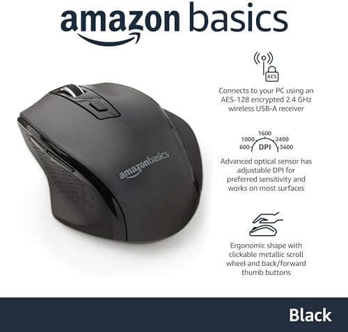 Amazon Basics Portable Wireless Computer Mouse, Ergonomic, 2.4 GHz Optical, DPI Adjustable, Easy to Use, Compatible With PC, Mac, Laptop, Black